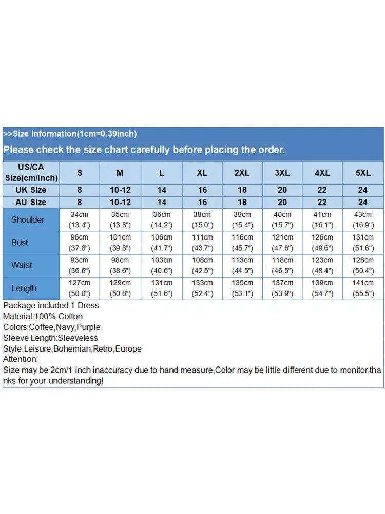 Material:100% Cotton Colors:Coffee,Navy,Purple Sleeve Length:Sleeveless Neckline:O-Neck Pattern:Solid Color Length:Mid-Calf Length Thickness:Thin Decoration:Side Pockets Features:Pure Cotton Style:Leisure,Bohemian,Retro,Europe Season:Spring,Summer,Autumn Occasion:Family,Party,Beach,Wedding,Holiday Attentions: 1.The Real Object May Exist Slightly Colors Differences Compared To Images As Different Computers Display.Caution If Minding,Thanks. 2.There Might Be A Manual Measuring 1-3 cm Error.Sorry For Any Inconvenience. 3.Please Prevail On Real Item, Model Images For Reference Only. 4.Attention!!!Please check the size chart carefully before placing the order.