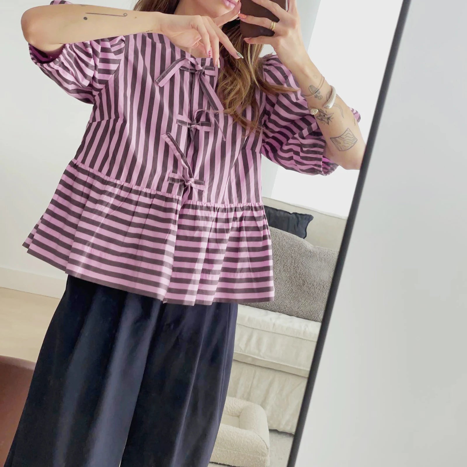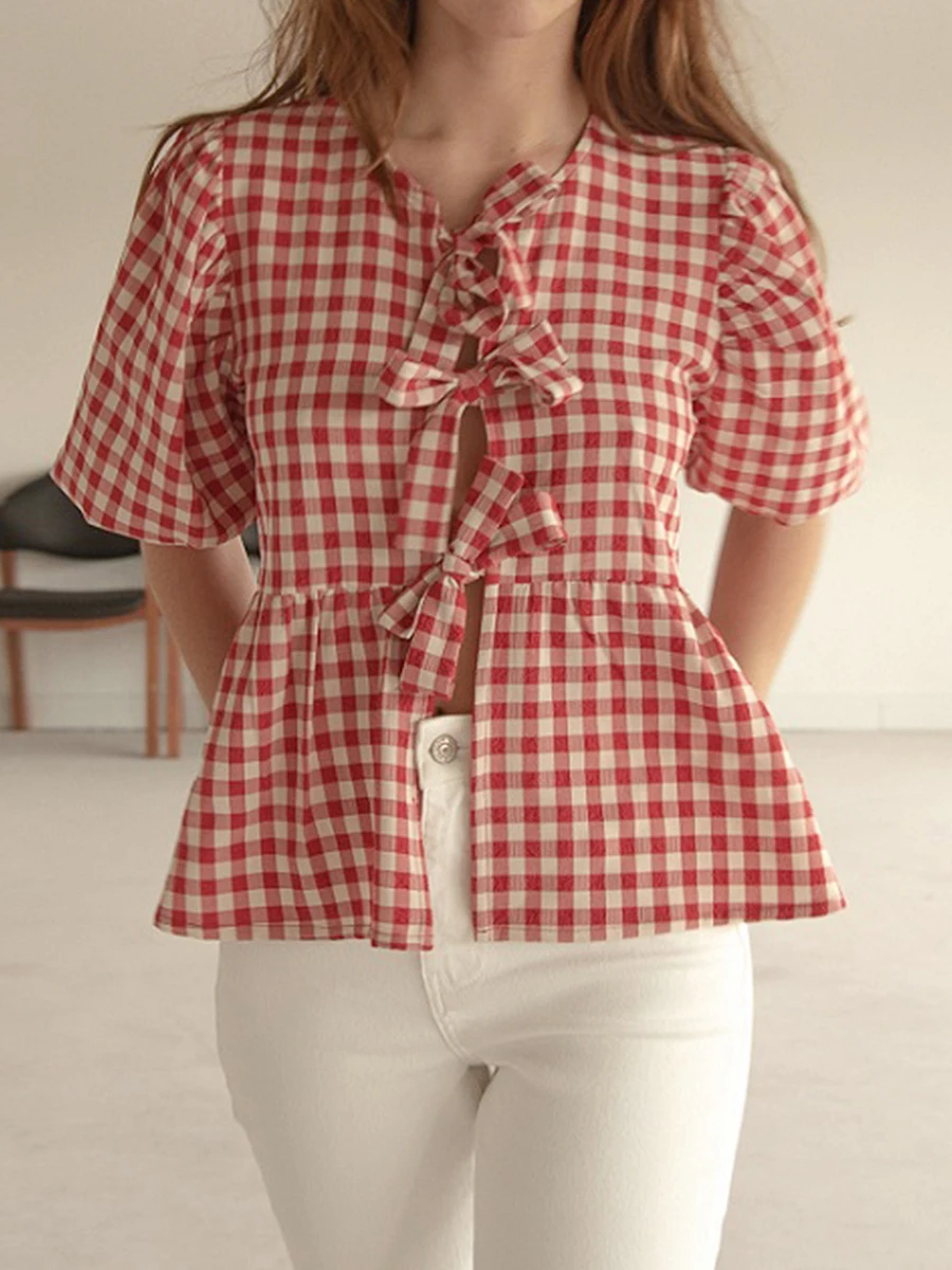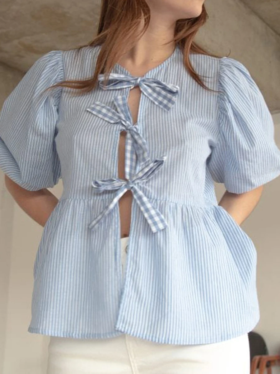 Fashion Women Peplum Shirt Puff Short Sleeve Lace Up Bow Blouse Tie Open Front