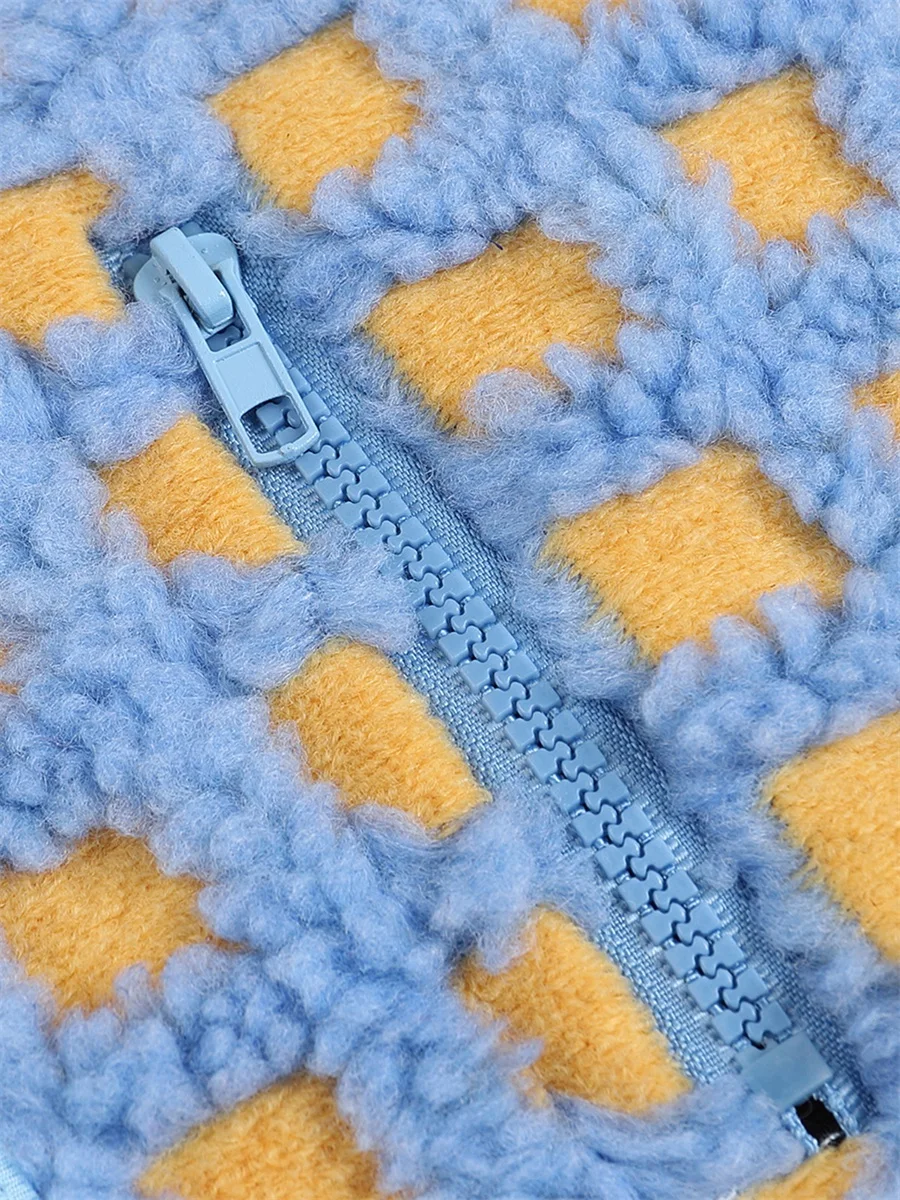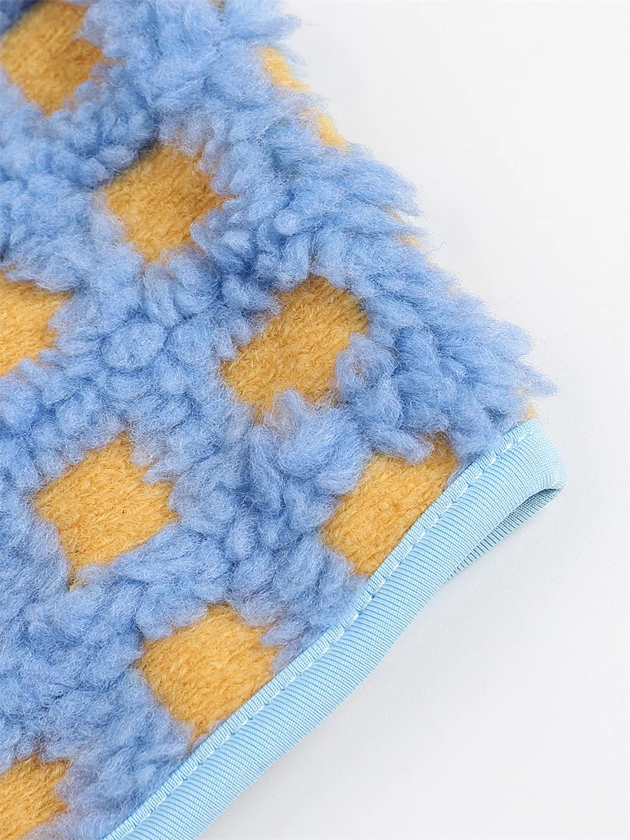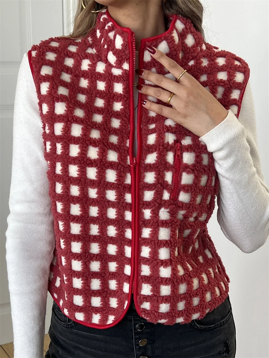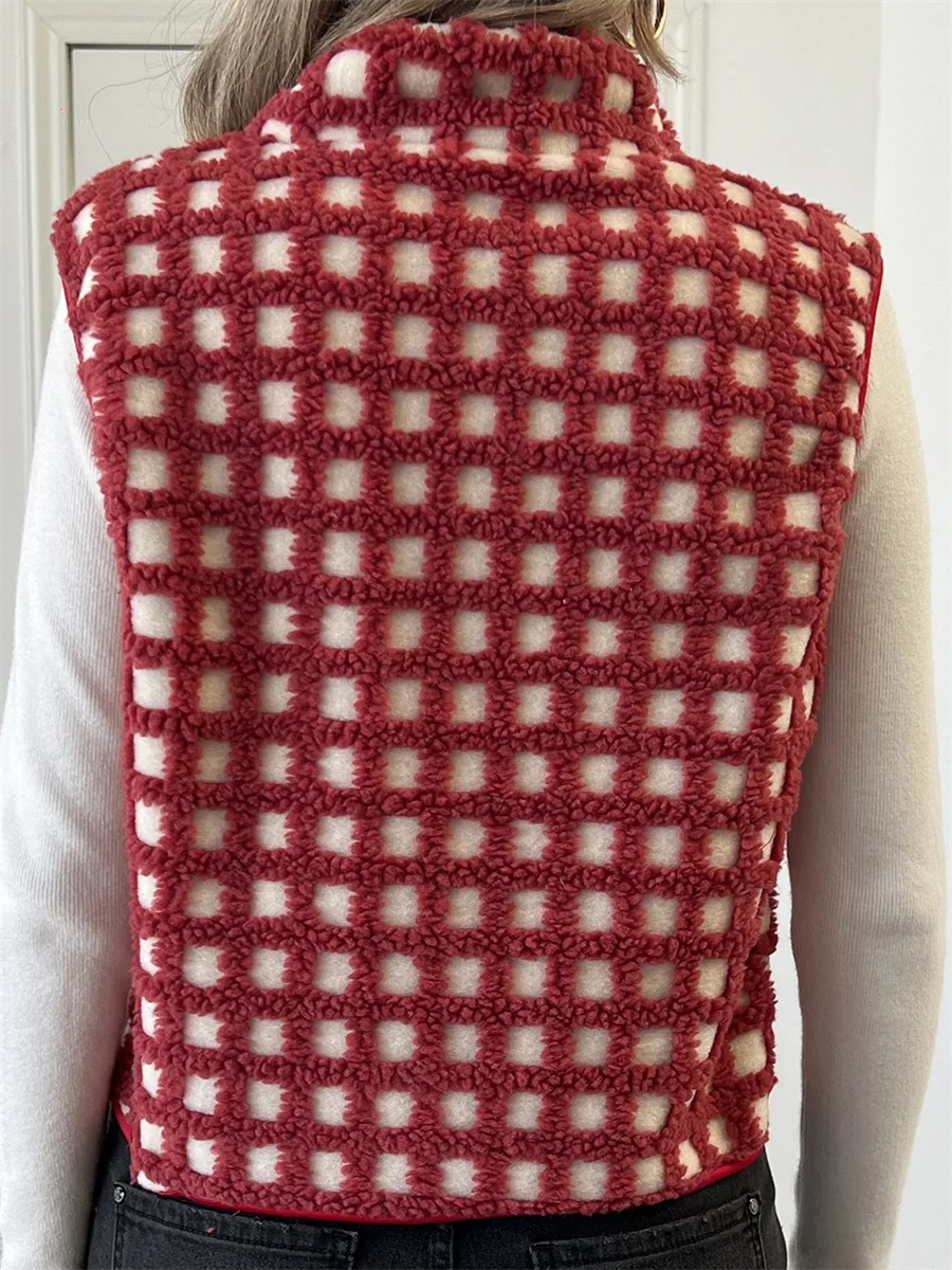 Womens Fuzzy Checkered Vest Sleeveless Stand Collar Zip Up Vest Jacket Winter Warm Outwear