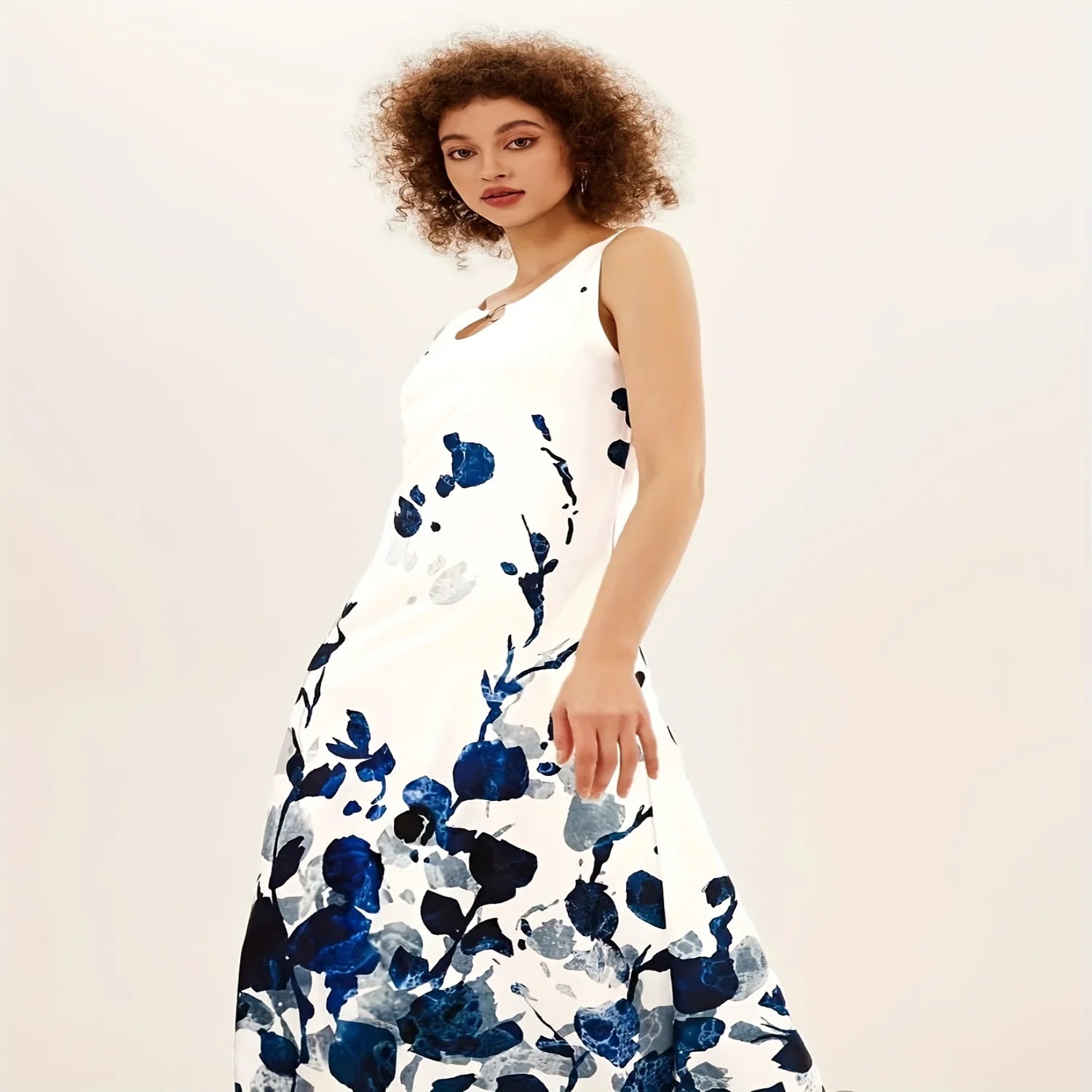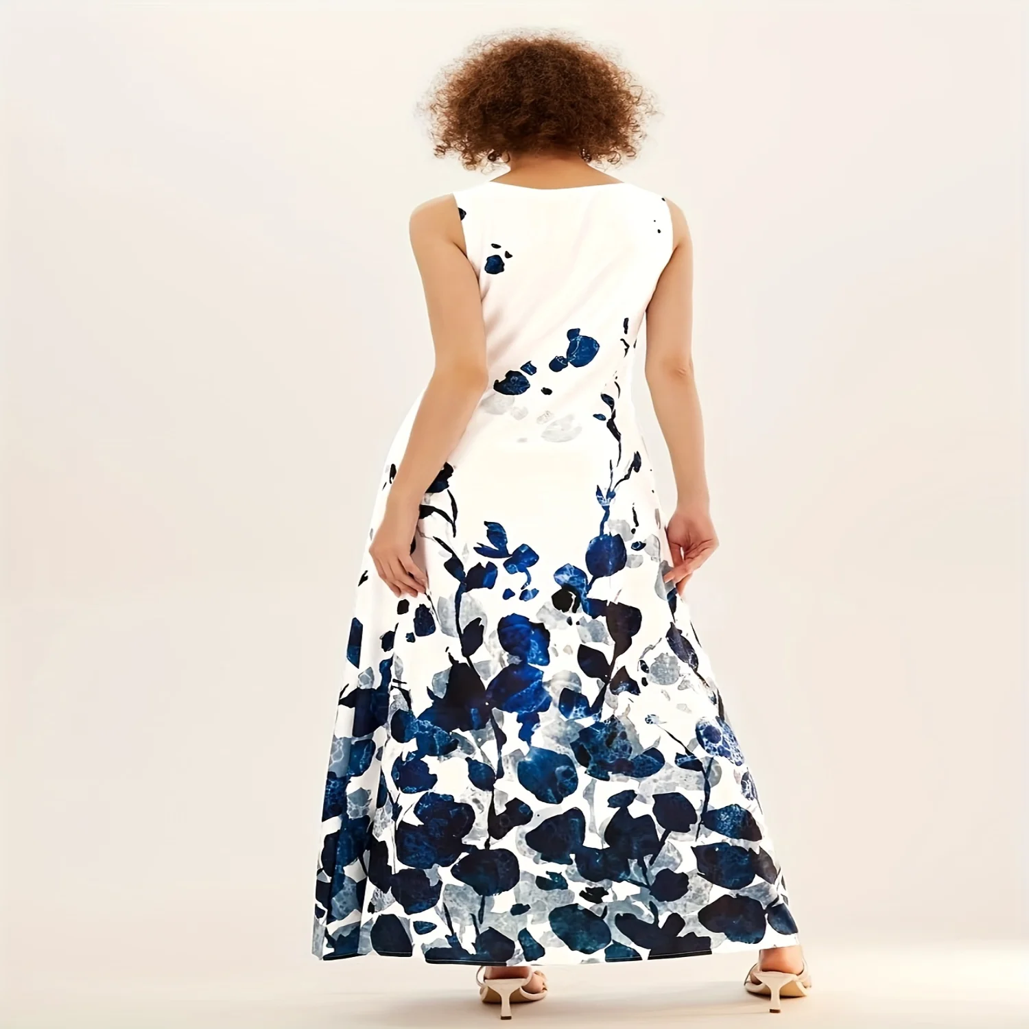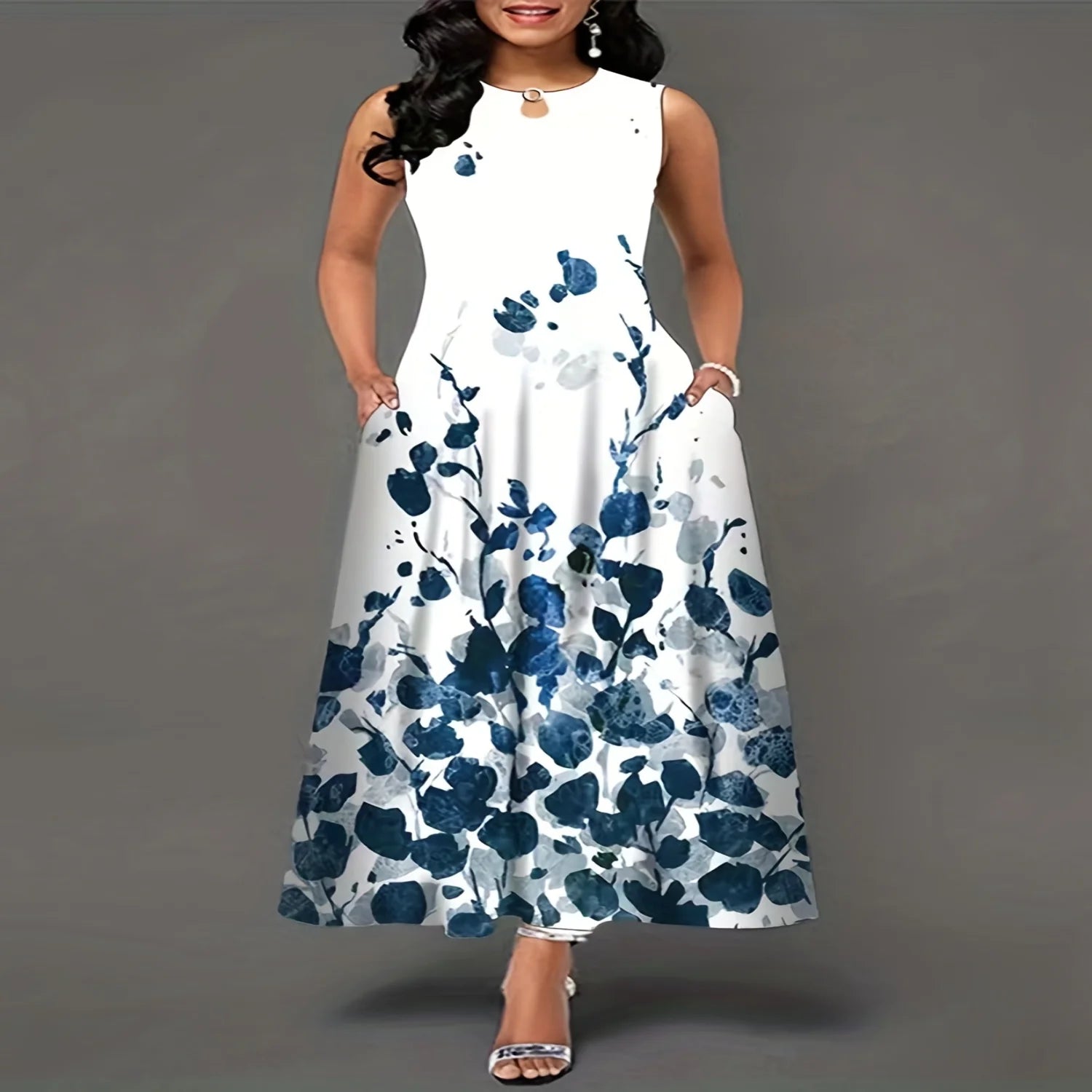 3. Stand out in style with this Sleeveless Crew Neck Maxi Dress, featuring a vibrant floral print and a flattering A-line silhouette. Its comfortable fit and versatile design make it a must-have for your spring and summer wardrobe.