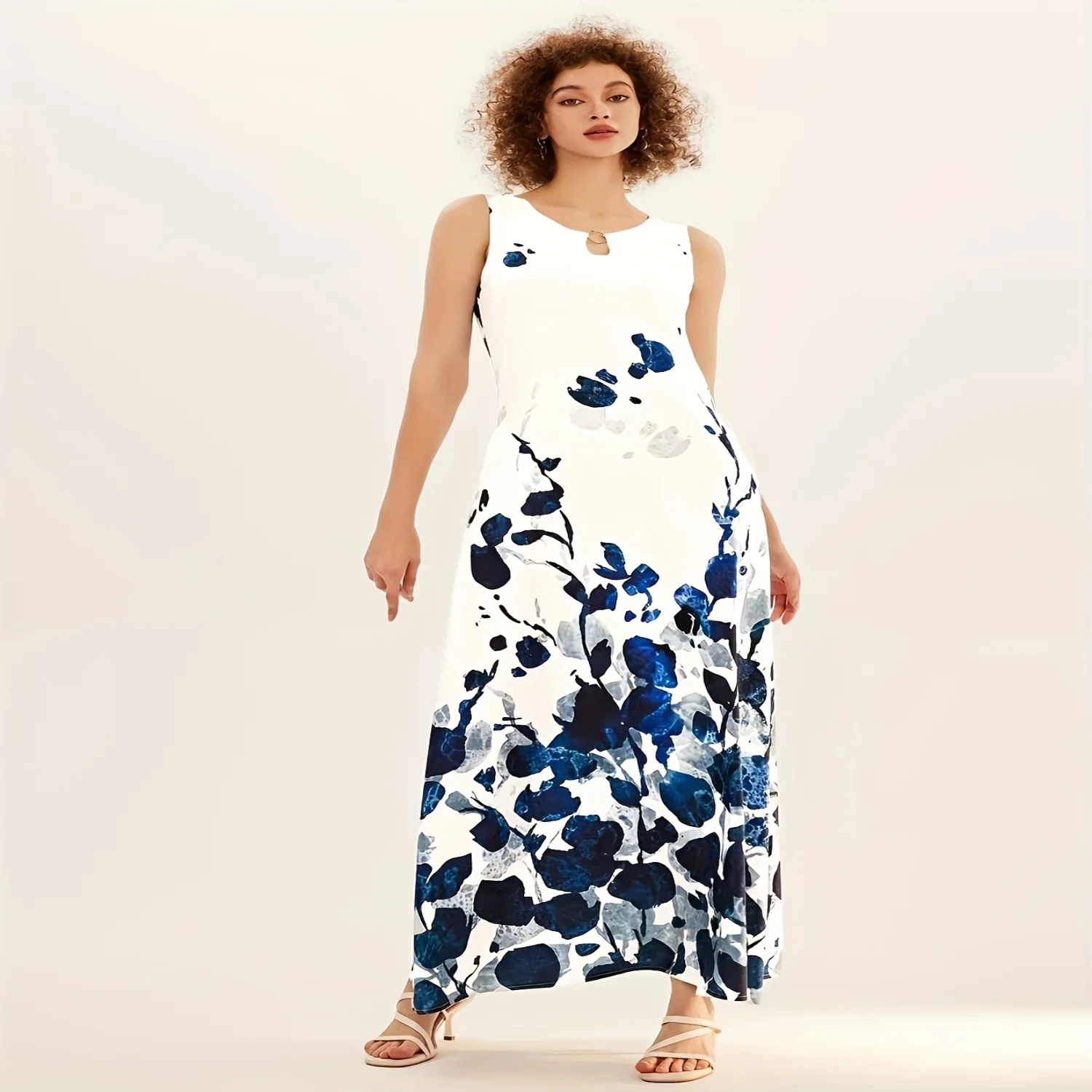 Flirty Floral Print Maxi Dress - Bohemian Chic, Sleeveless Crew Neck with Keyhole - Pockets for Women - Perfect Casual Summer Dr