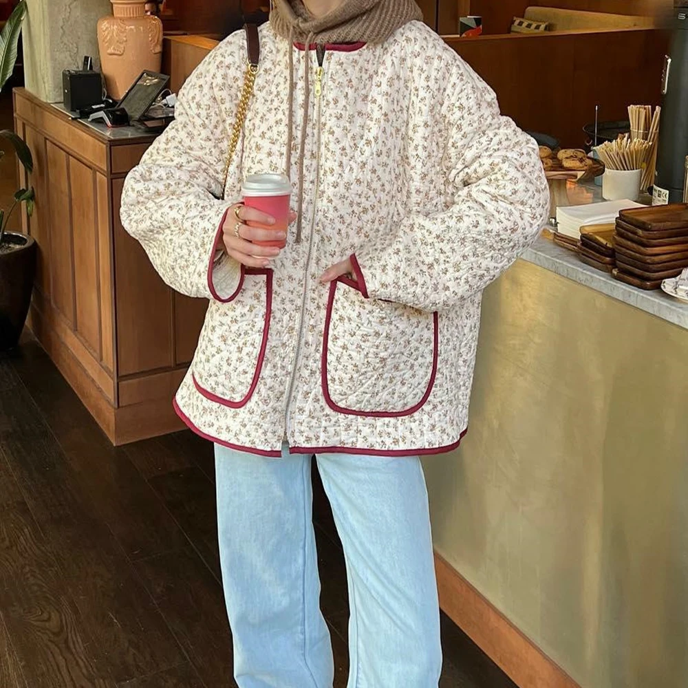 Floral Print Pocket Cardigan Quilted Jacket Elegant High Street Outerwear