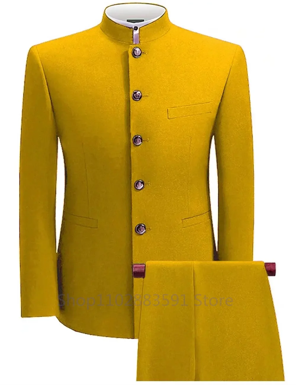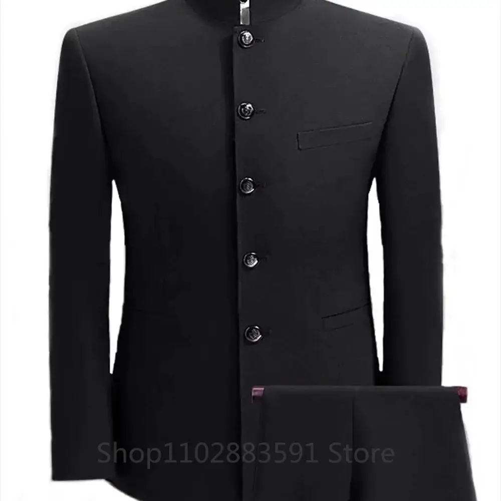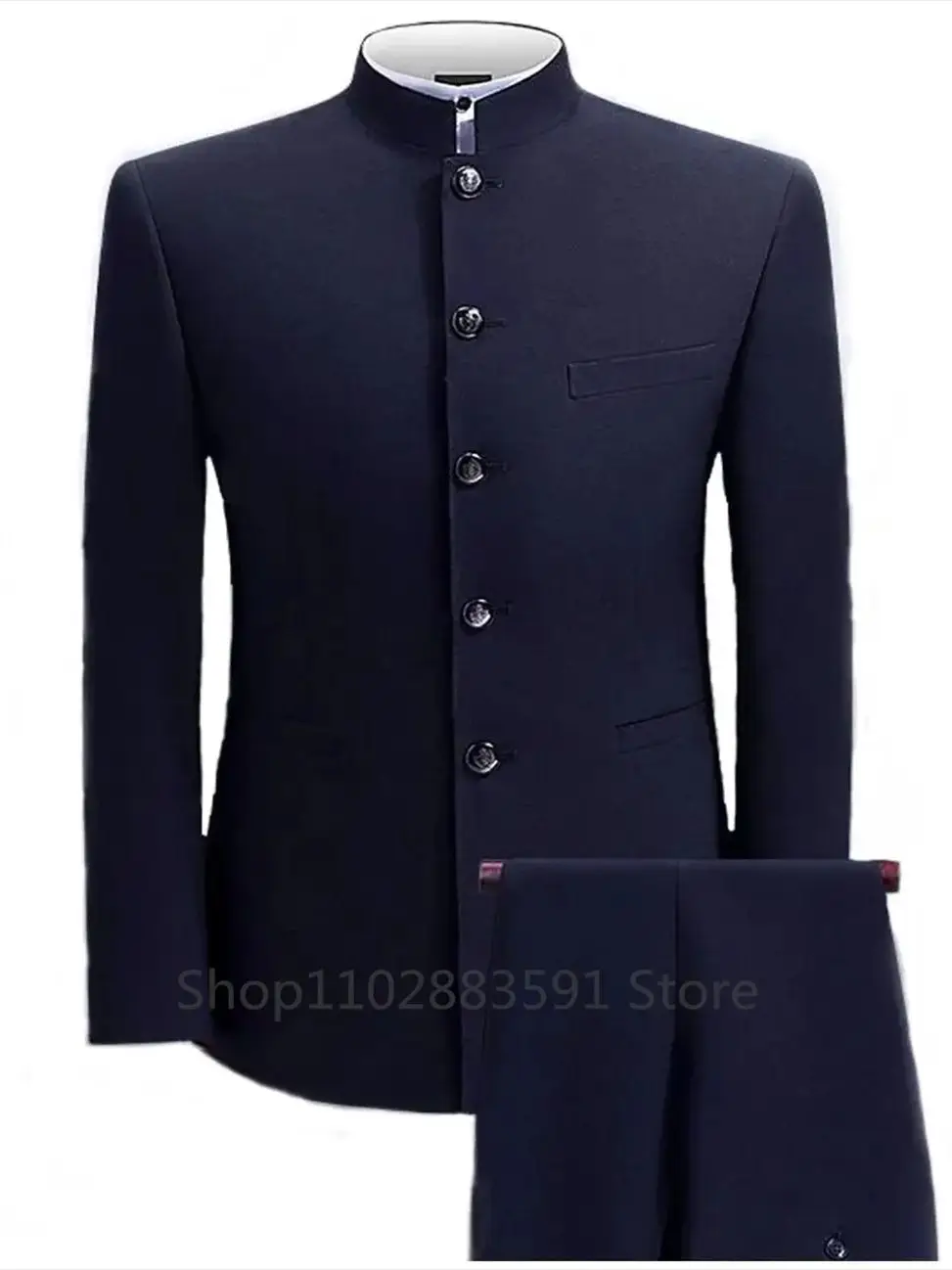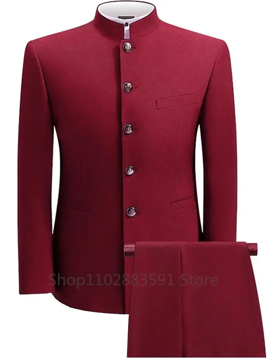 Formal Men's Business 2 Pieces Blazer + Pants Stand Lapel Men's Jacket Flat Suit Slim Fit Coat Groomsmen Party
