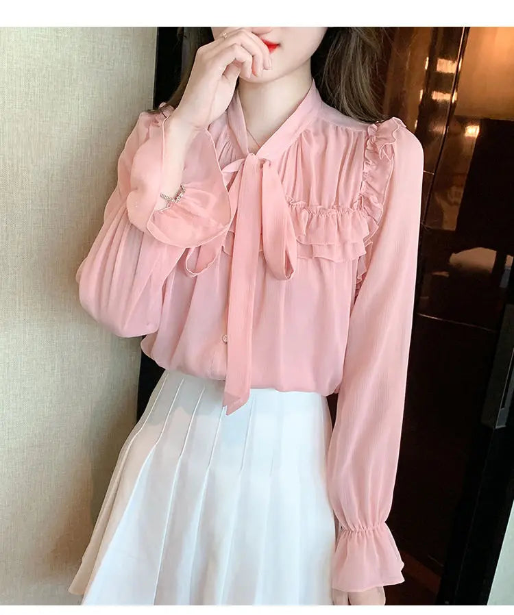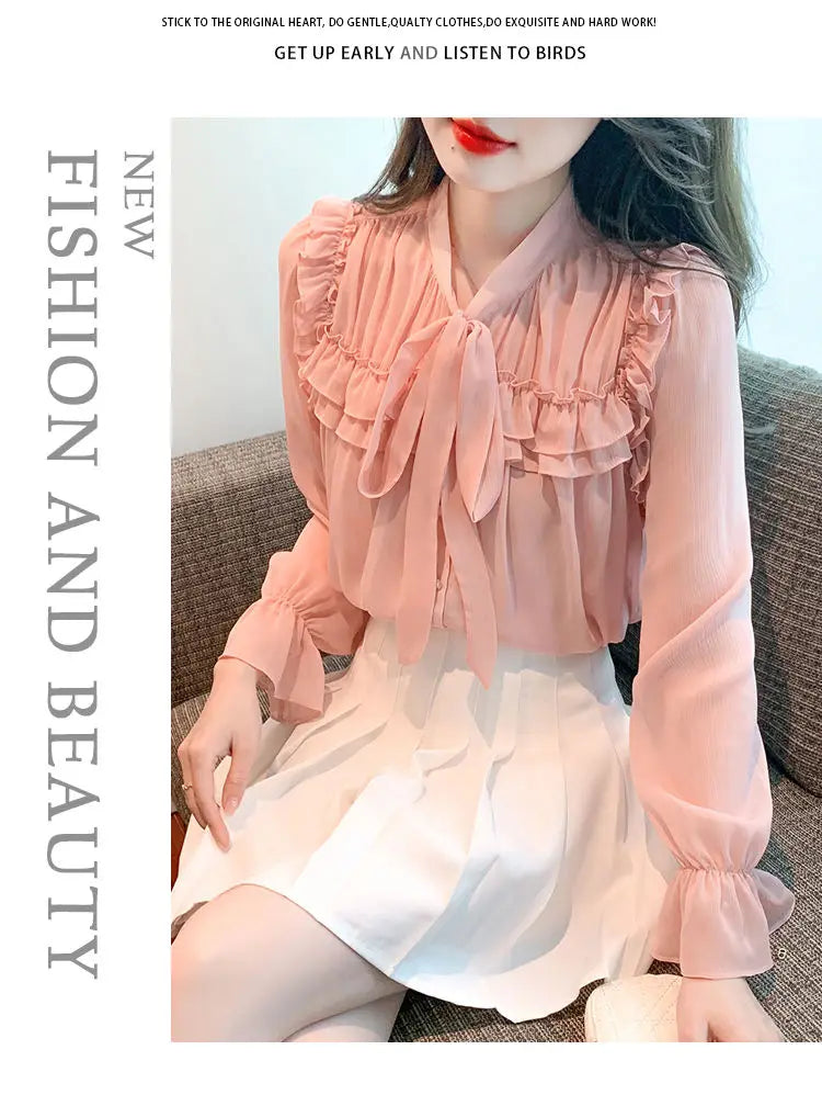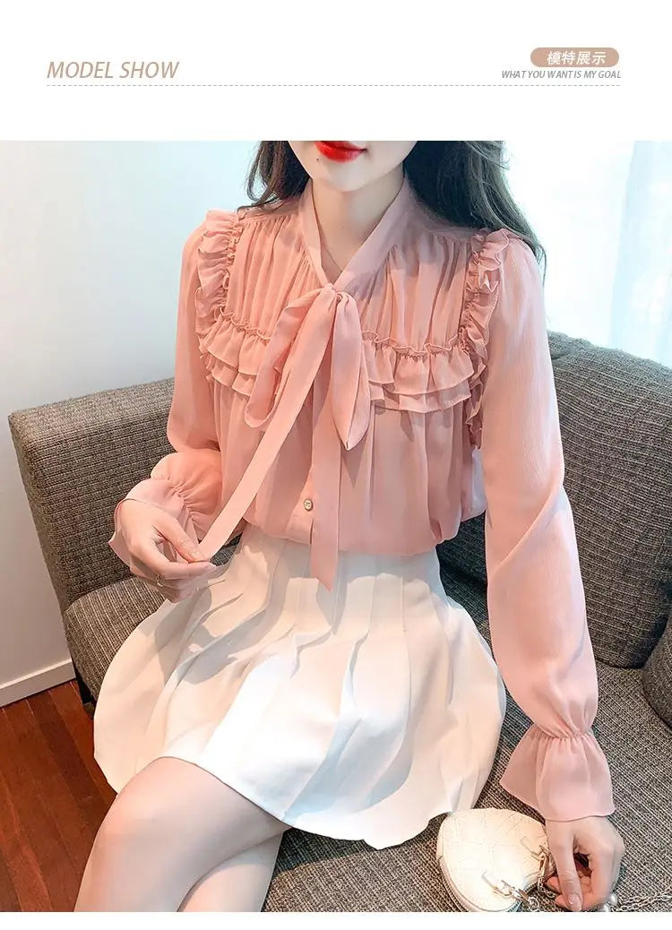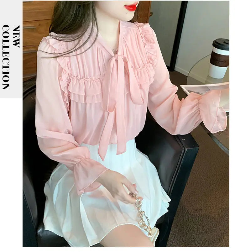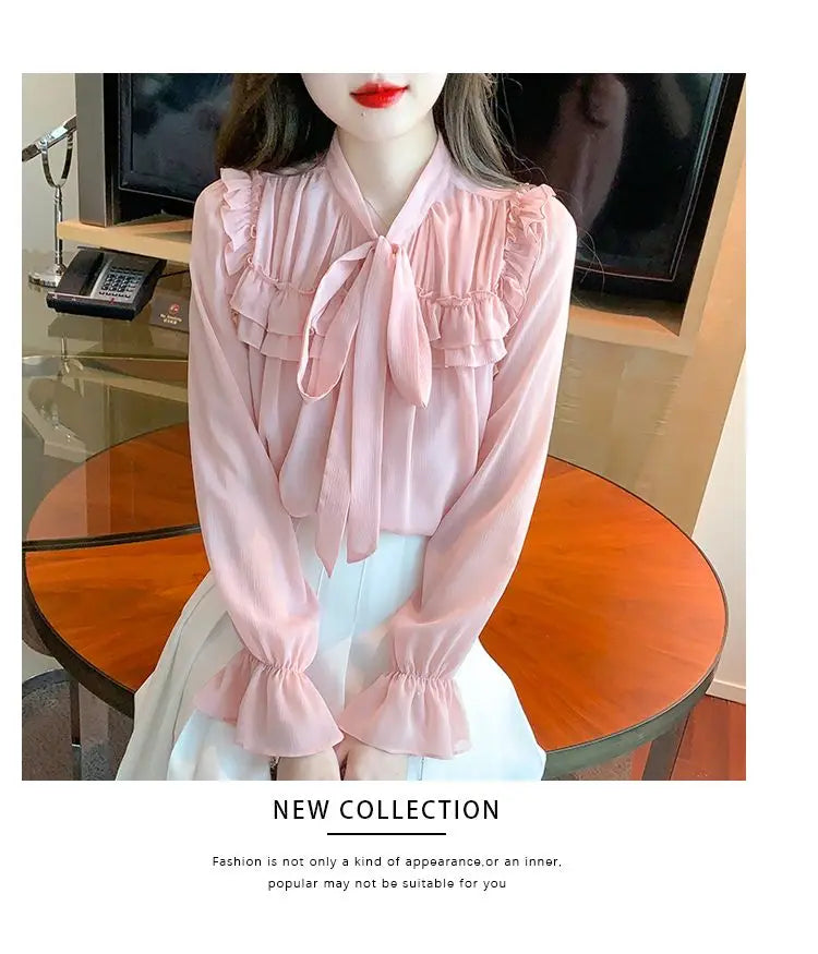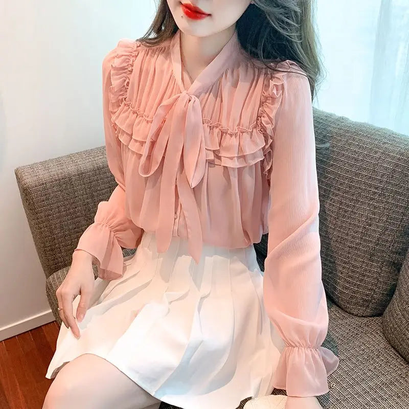 French Bow Tie Tied Chiffon Shirt for Women's New Stylish and Versatile Ruffle Edge Bottom Top