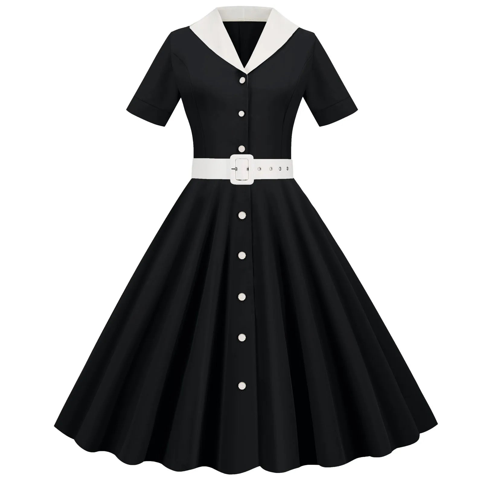 Channel retro vibes with this 60s-inspired rockabilly dress, designed for women who love vintage flair with modern comfort. Made from soft, stretchy polyester, it features a flattering A-line silhouette, a classic turn-down collar, and a mid-calf length for that authentic retro look. The short sleeves and pullover design add ease and wearability, while the solid color keeps it versatile for any occasion. Perfect for casual outings or themed events, this dress is a timeless nod to vintage fashion.