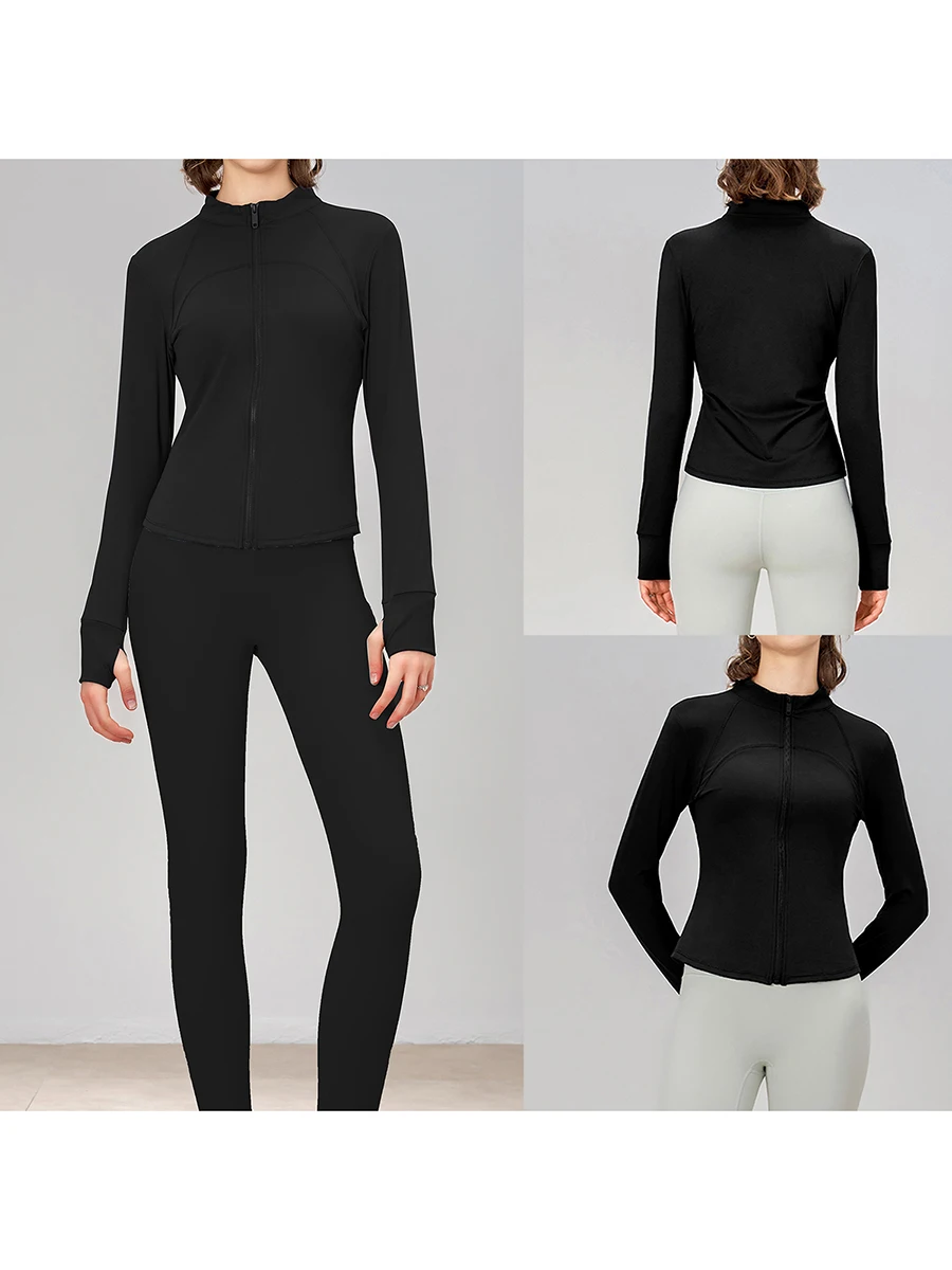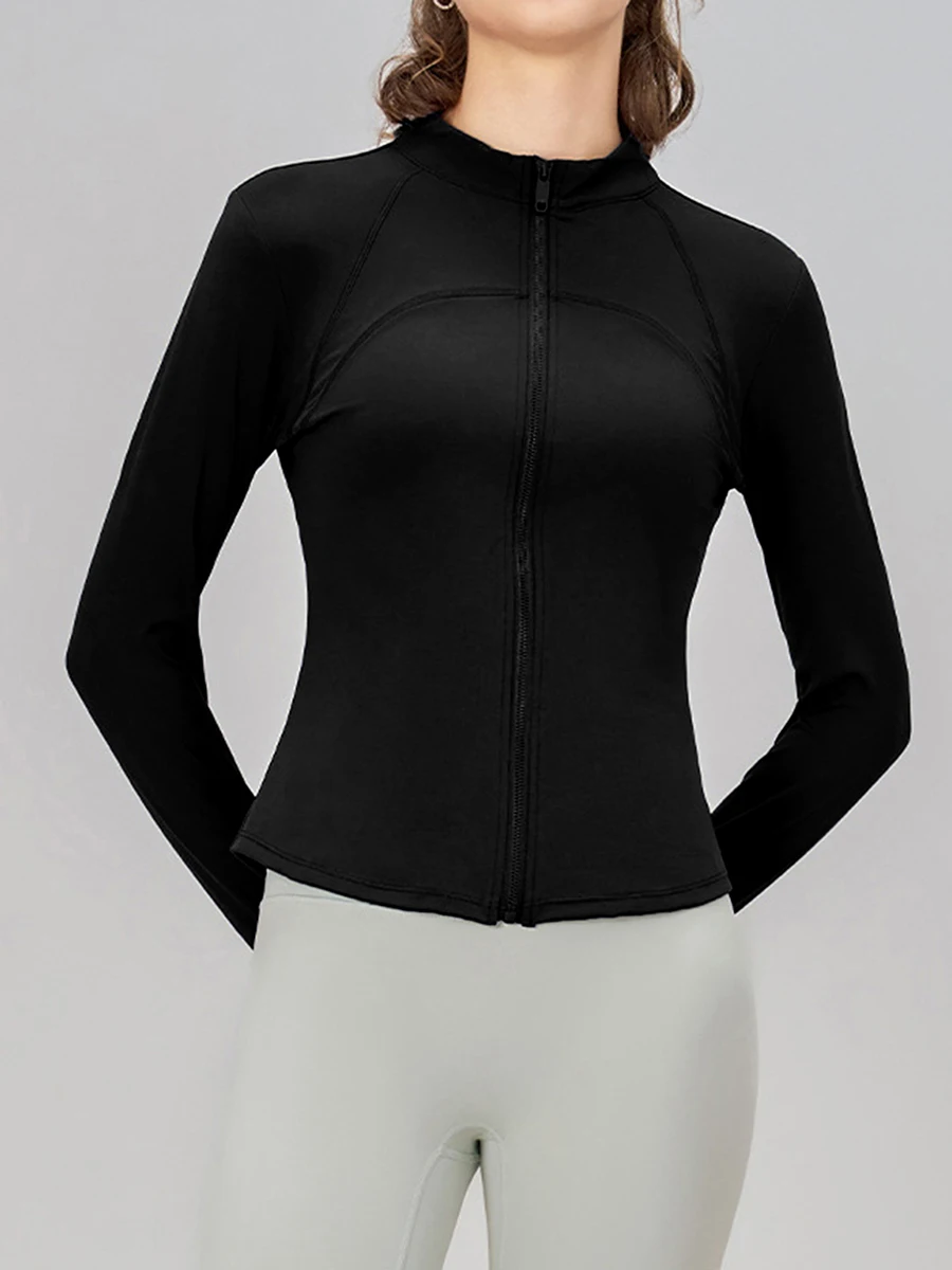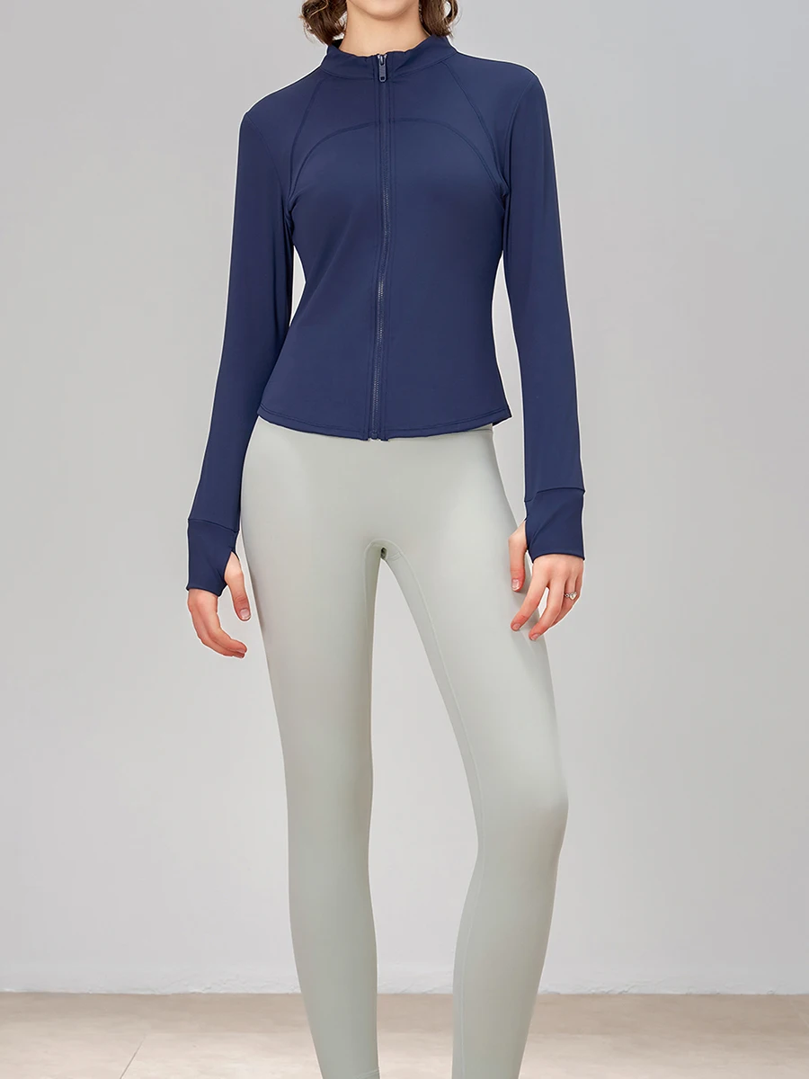 Full Zip Yoga Jacket with Solid Color Long Sleeves Stand Collar Fit and Thumb Holes for Active Wear