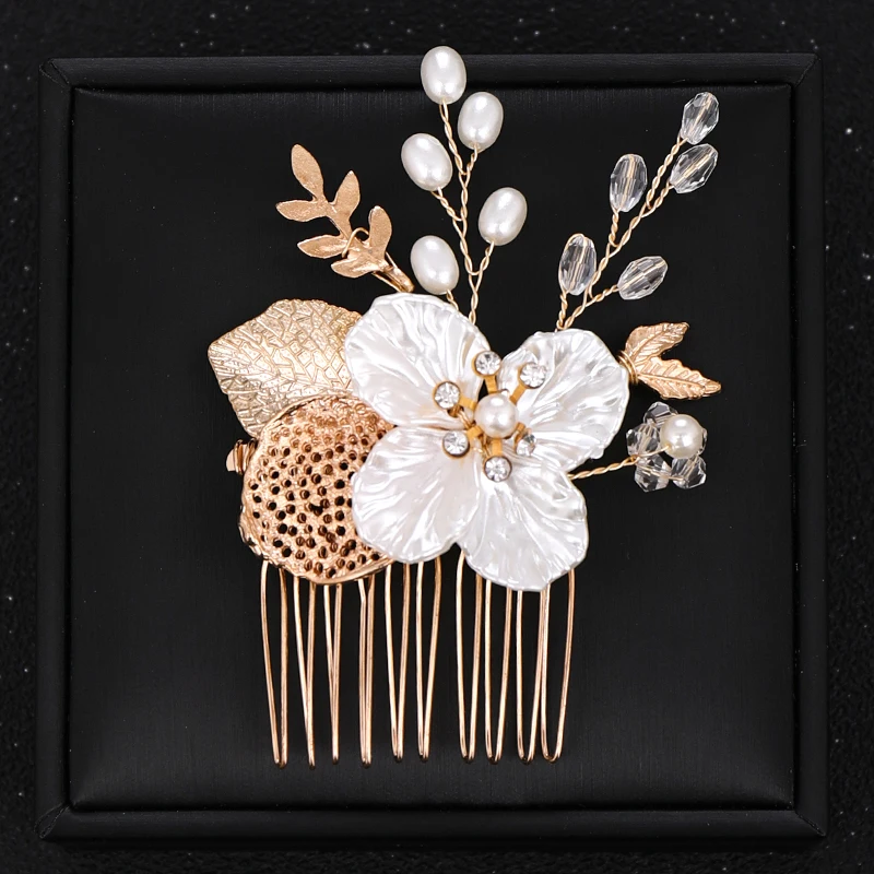 Item Type: Wedding tiara/ Hair CombsMaterial:Simulated Pearl,Rhinestone, Zinc AlloyProcess: HandmadeMain Color: Silver,GoldLength: 7cmWidth: 6cmWeight: 14gOccasions: Wedding/Party/Prom/AnniversaryGift for: Bride/Bridesmaid/Christmas Gift/New Year