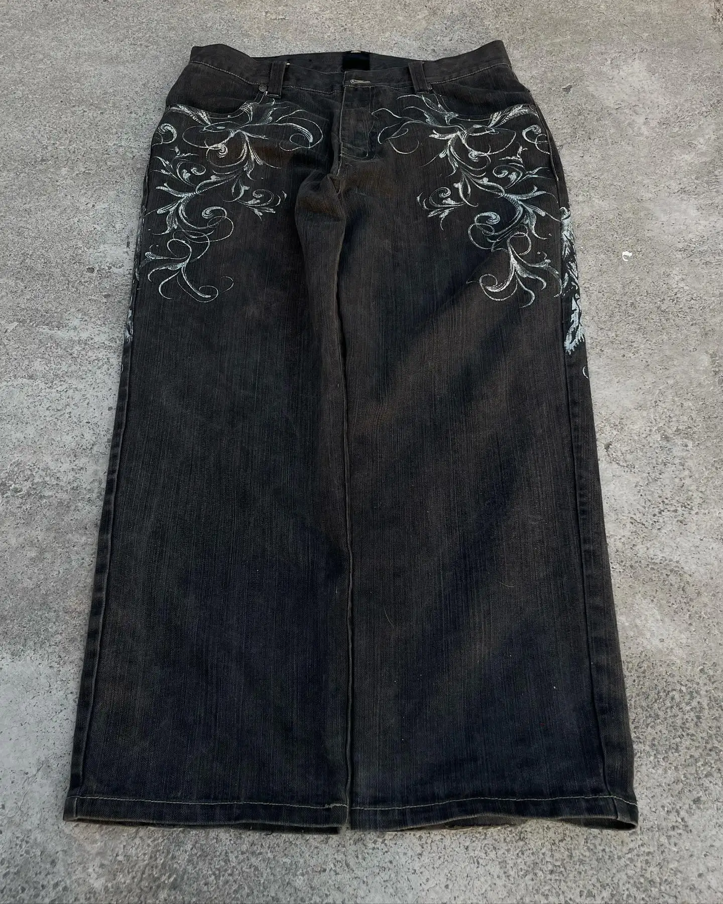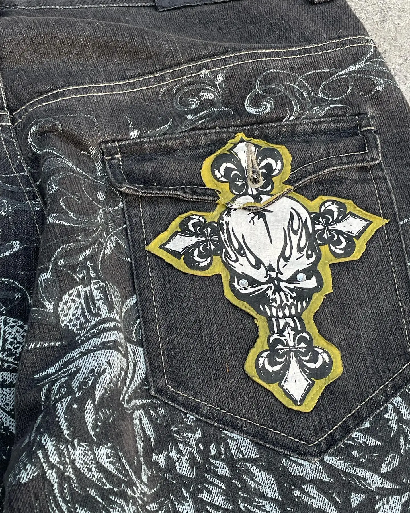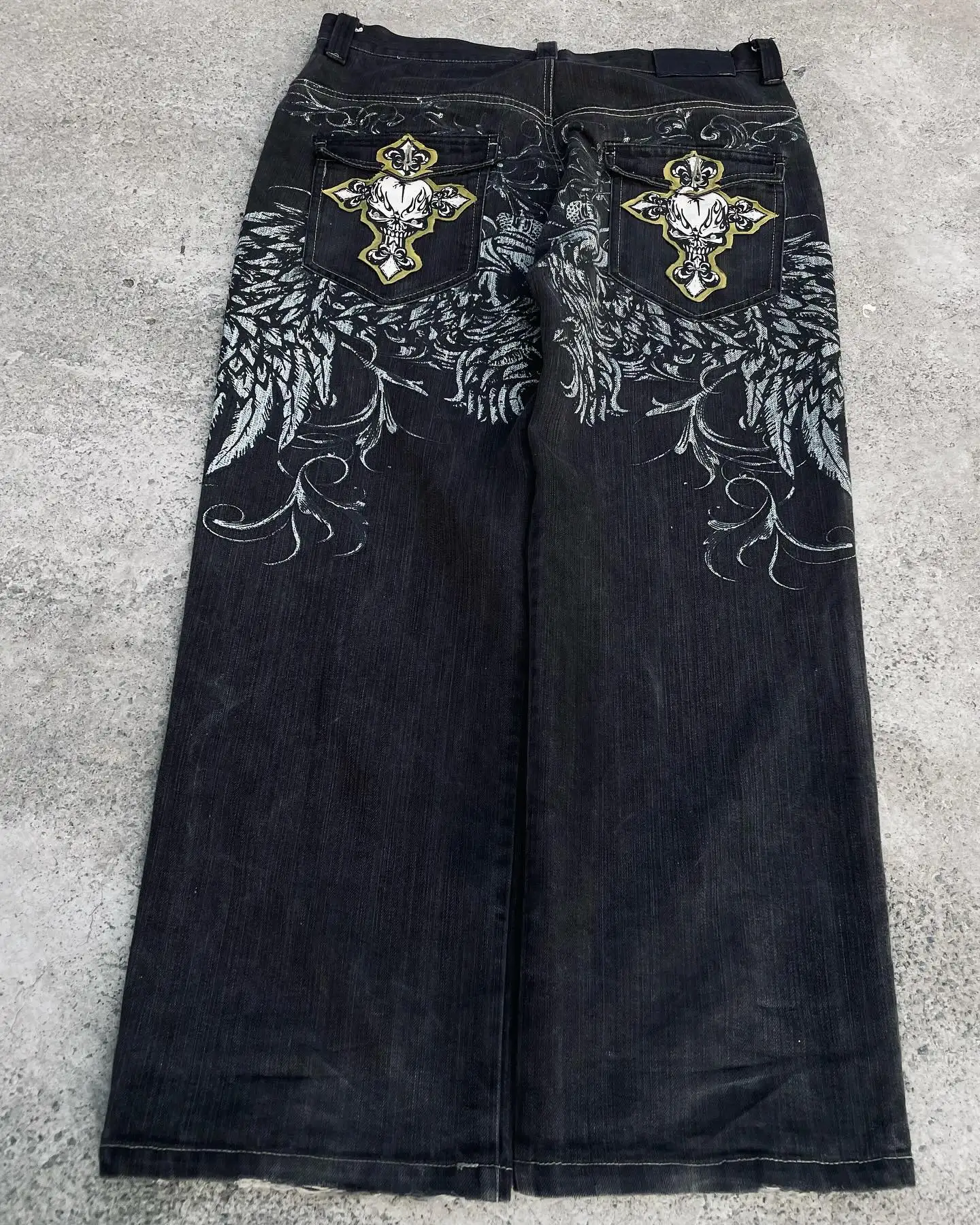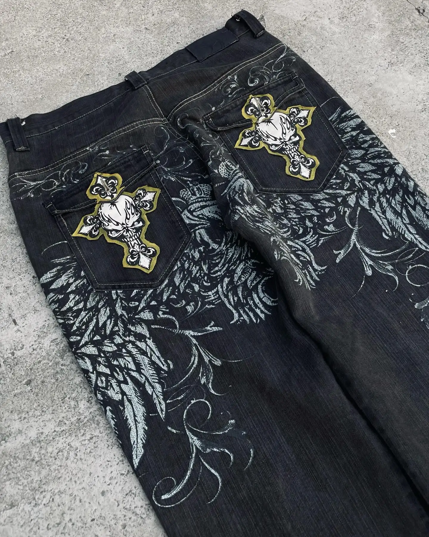 Gothic Retro American Cross Embroidery Patchwork Baggy Jeans Streetwear Casual Straight Wide-leg Pants