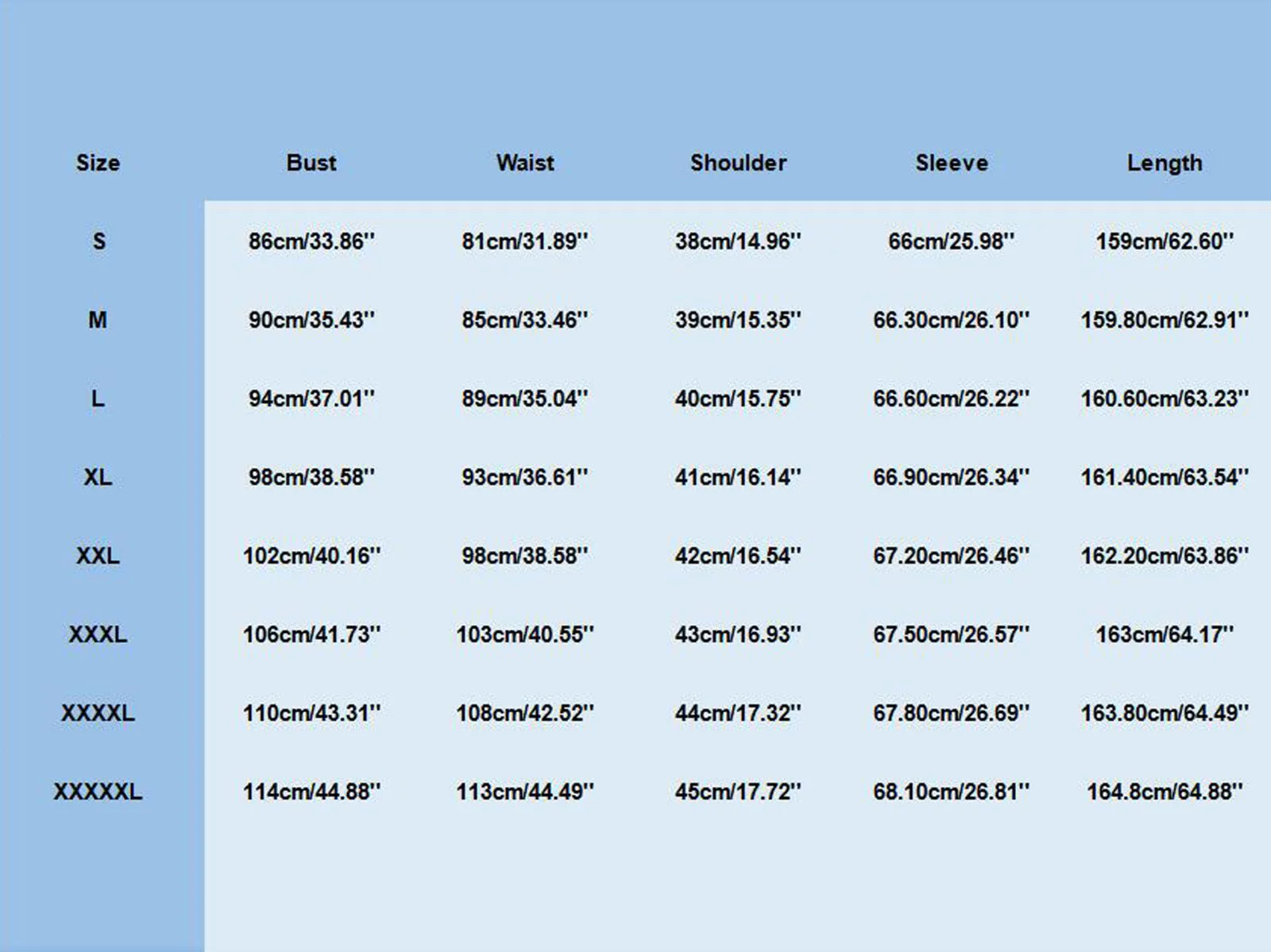 | Size | Bust | Waist | Shoulder | Sleeve | Length |