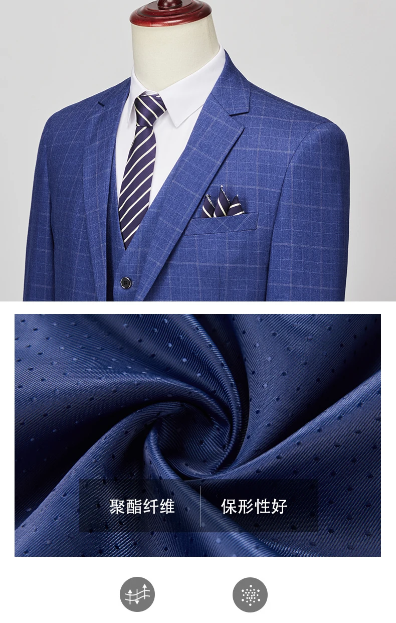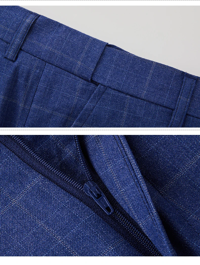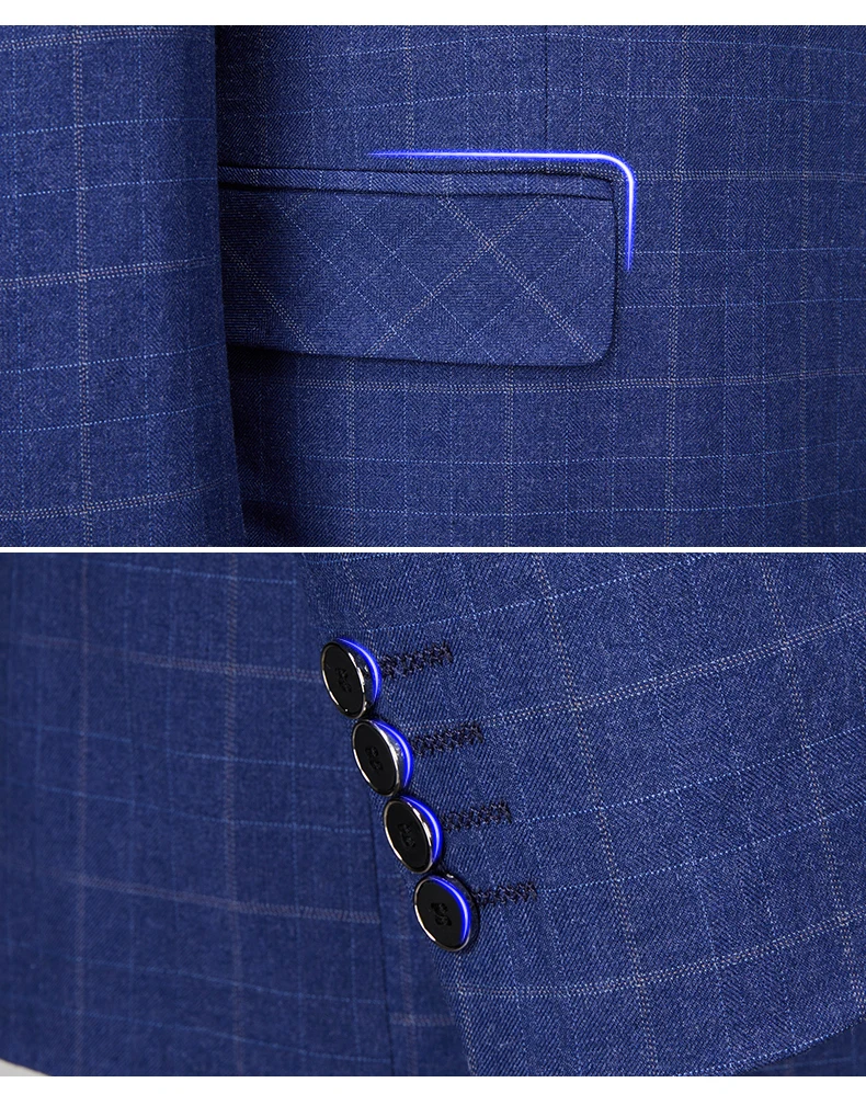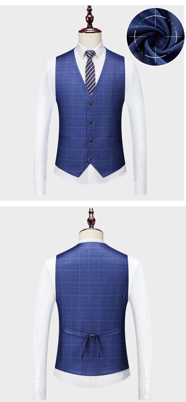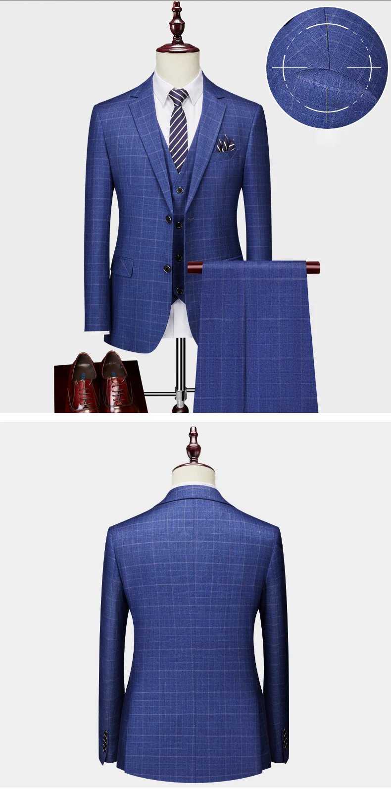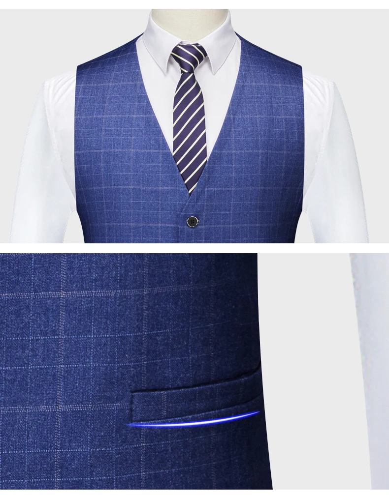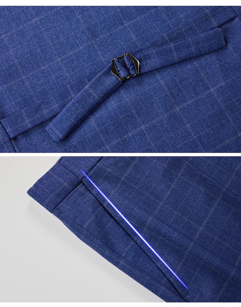 This high-end 3-piece men's suit set, featuring a jacket, vest, and pants, brings timeless style to any party or special occasion. Available in classic blue or gray plaid, it blends retro charm with modern tailoring. Crafted from a comfortable polyester-viscose blend, the single-breasted design with flat-front trousers offers a sleek, formal look—perfect for weddings, official events, or standout party attire year-round.