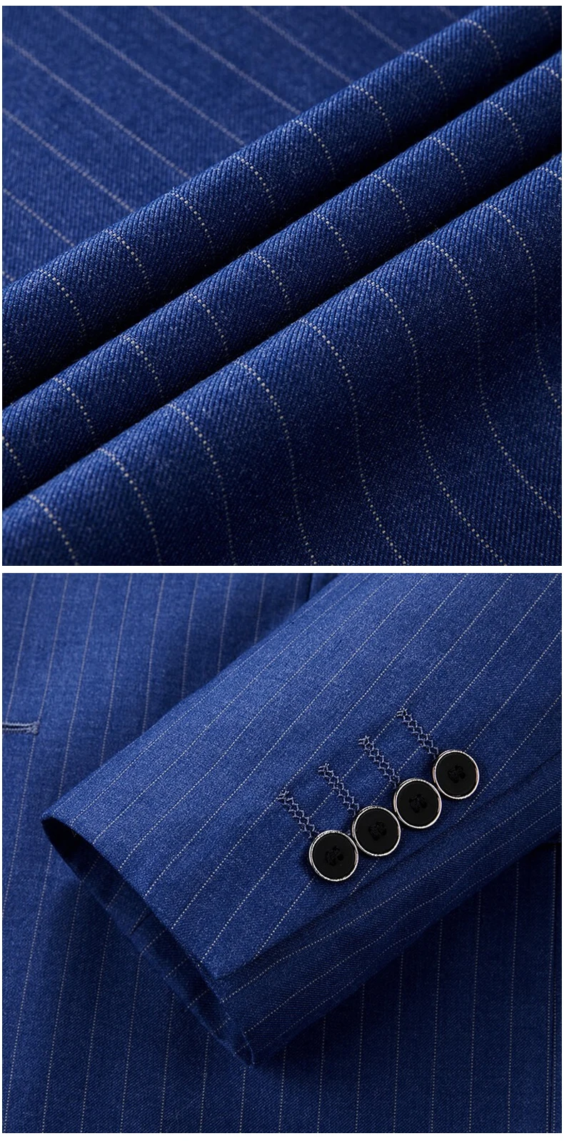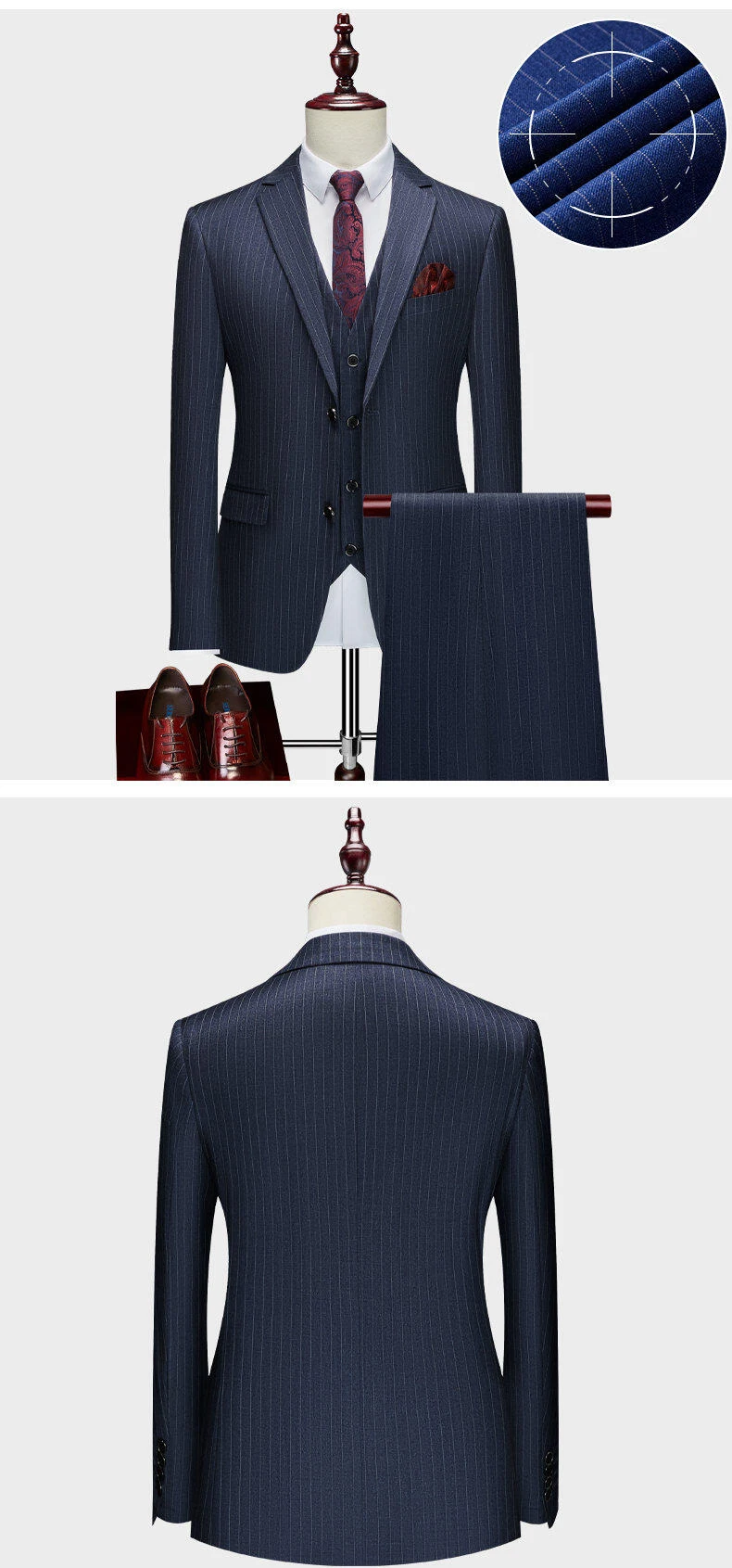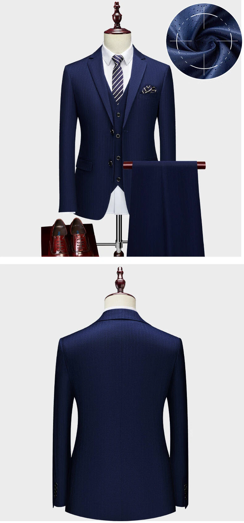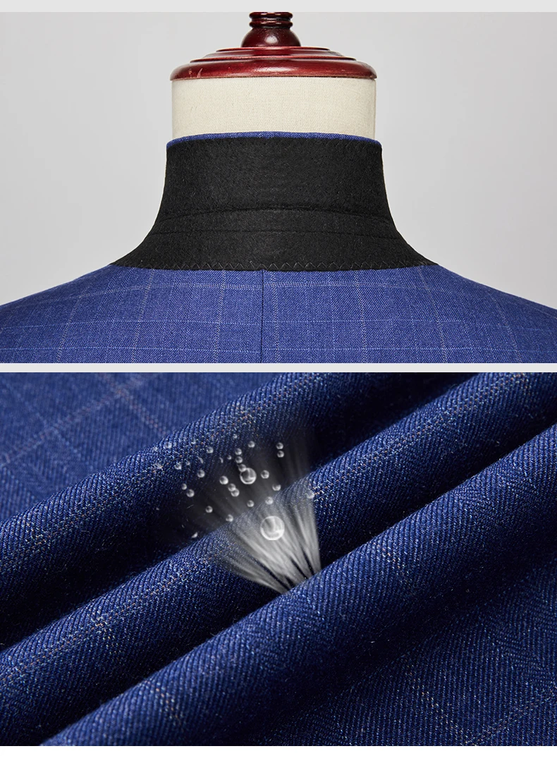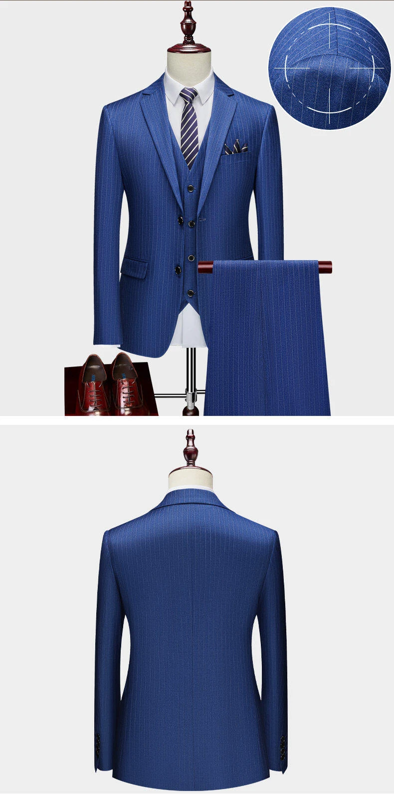 This high-end 3-piece men's suit set, featuring a jacket, vest, and pants, brings timeless style to any party or special occasion. Available in classic blue or gray plaid, it blends retro charm with modern tailoring. Crafted from a comfortable polyester-viscose blend, the single-breasted design with flat-front trousers offers a sleek, formal look—perfect for weddings, official events, or standout party attire year-round.