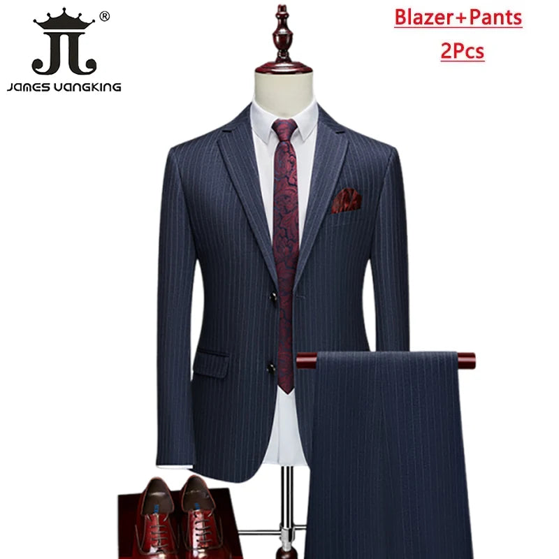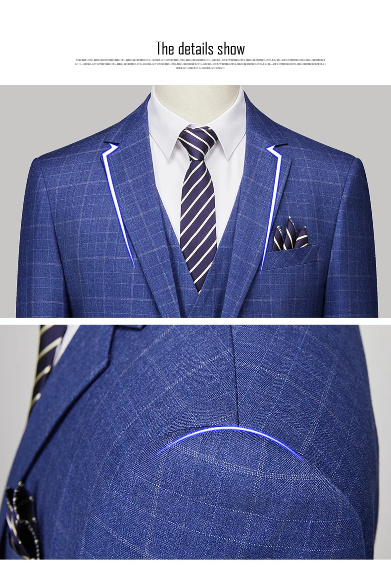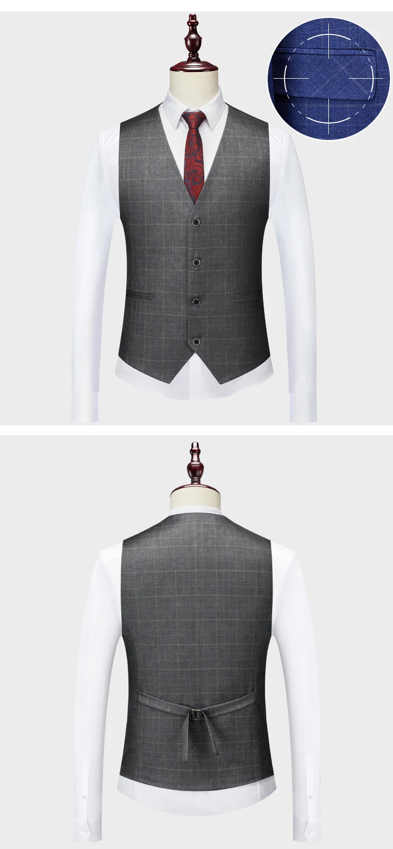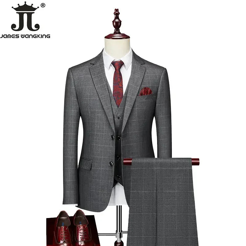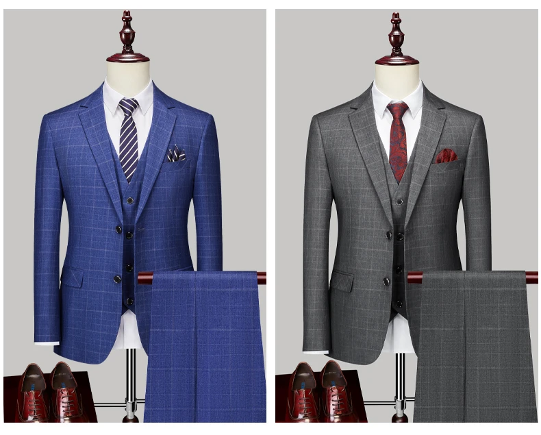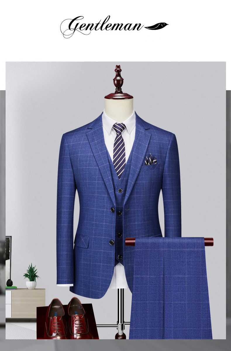 High-end Brand Classic Blue or Gray Plaid Men's Casual Business Suit Retro Official Suit Groom Wedding Dress Jacket Vest Pants