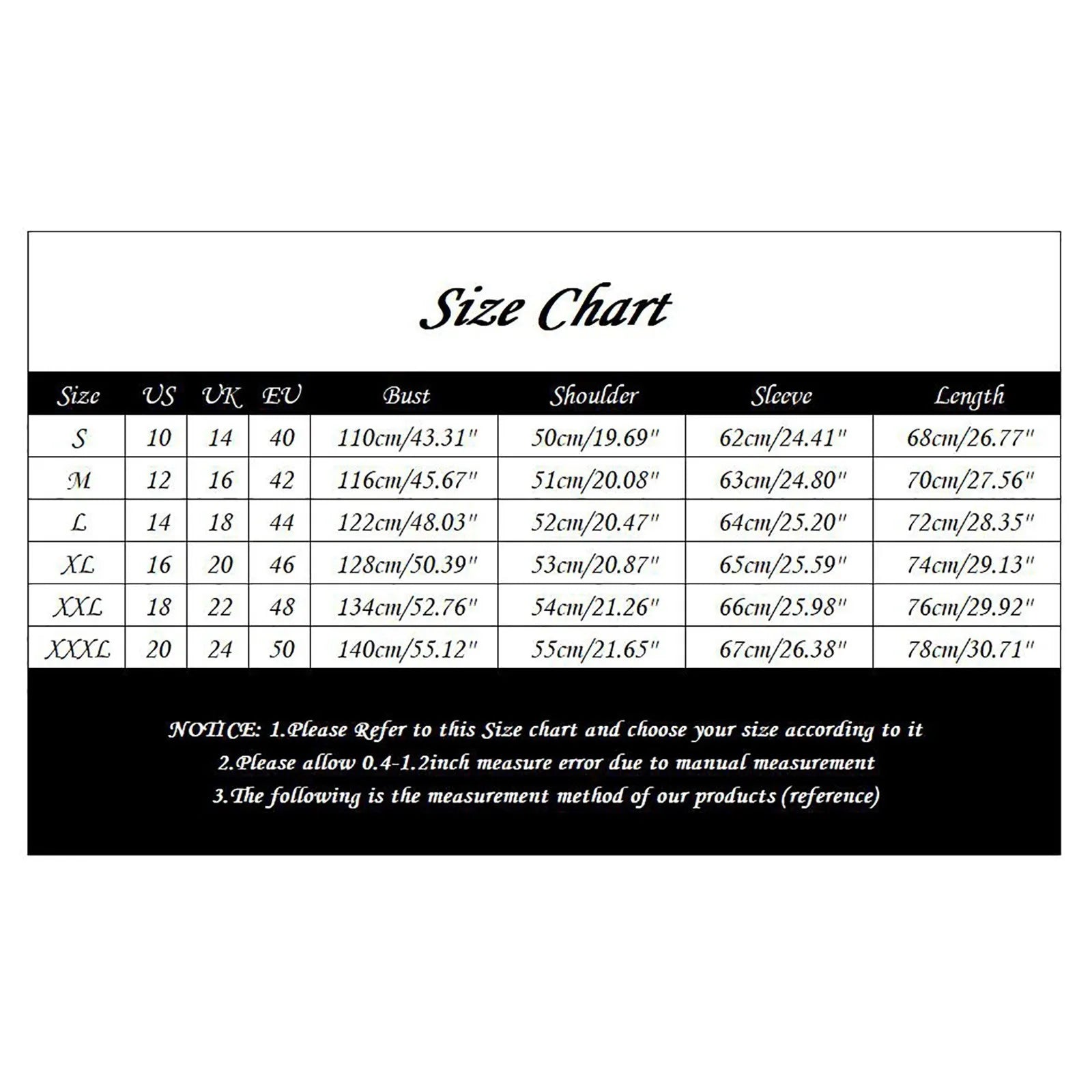| Size:XXXL | US:20 | UK:24 | EU:50 | Bust:140cm/55.12'' | Shoulder:55cm/21.65'' | Sleeve:67cm/26.38'' | Length:78cm/30.71'' |