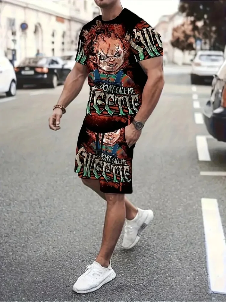 Hip Hop Style Personality Cartoon 3D Printed Men's Round Neck Short Sleeve 2 piece Fashionable Street Sports All-match Men's Suit