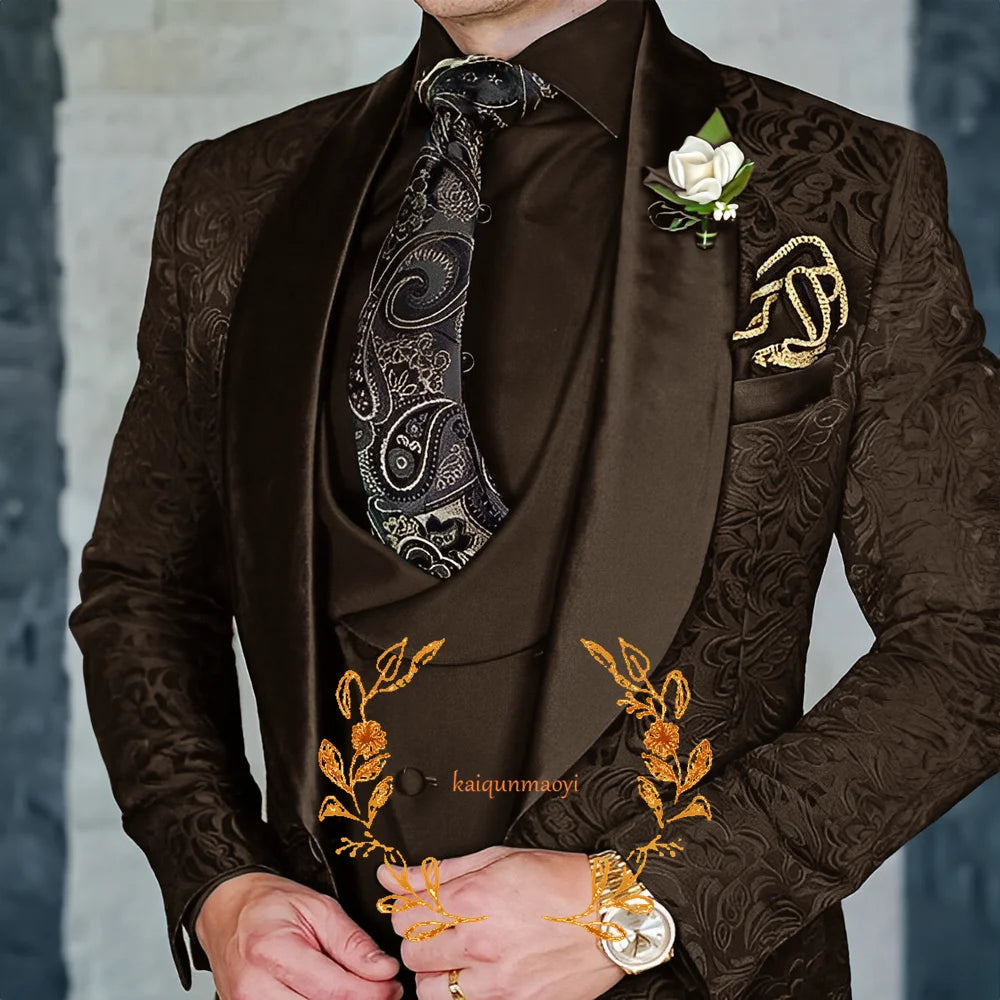 Jacquard Elegant Men's 3 Piece Suit Set Wedding Groom Tuxedo Jacket Pants Vest Formal Party Dress