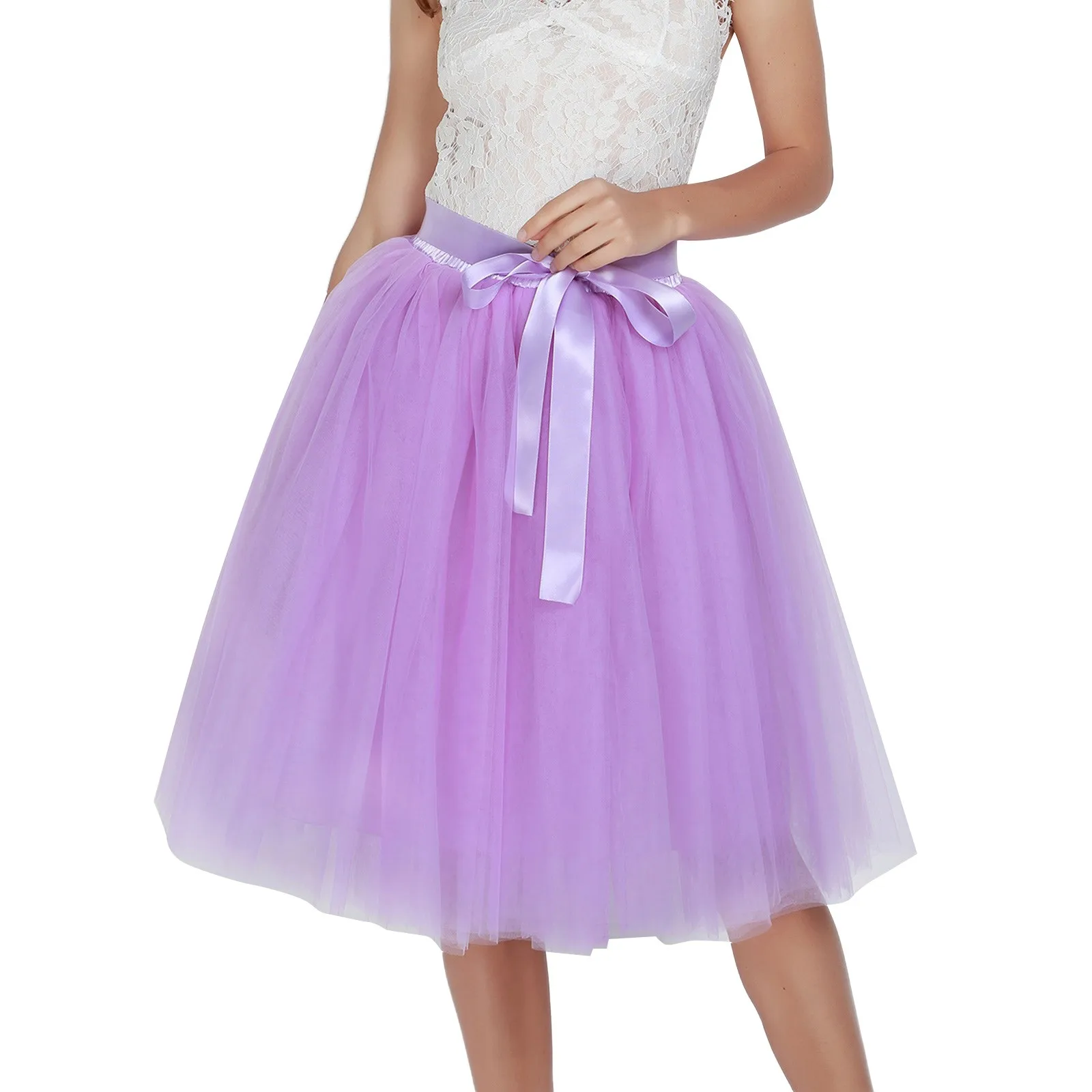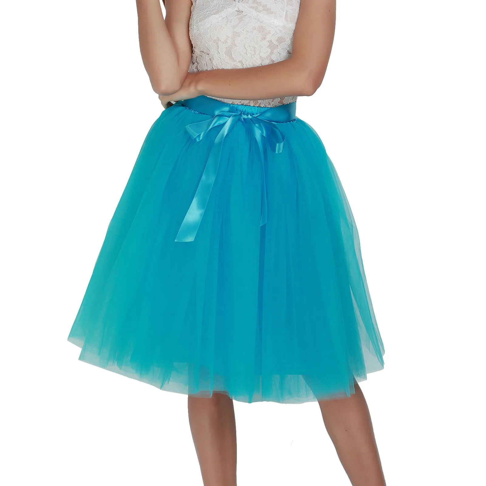 Knee Length Women A-Line Tulle Skirts Lace Up Multi Layered Tulle Petticoat Midi Skirt