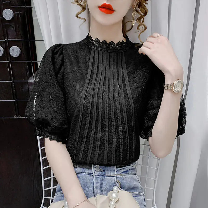 Lace Edge Waisted Short Sleeve Loose Versatile Chiffon Hollow Mesh Pullover loose fit