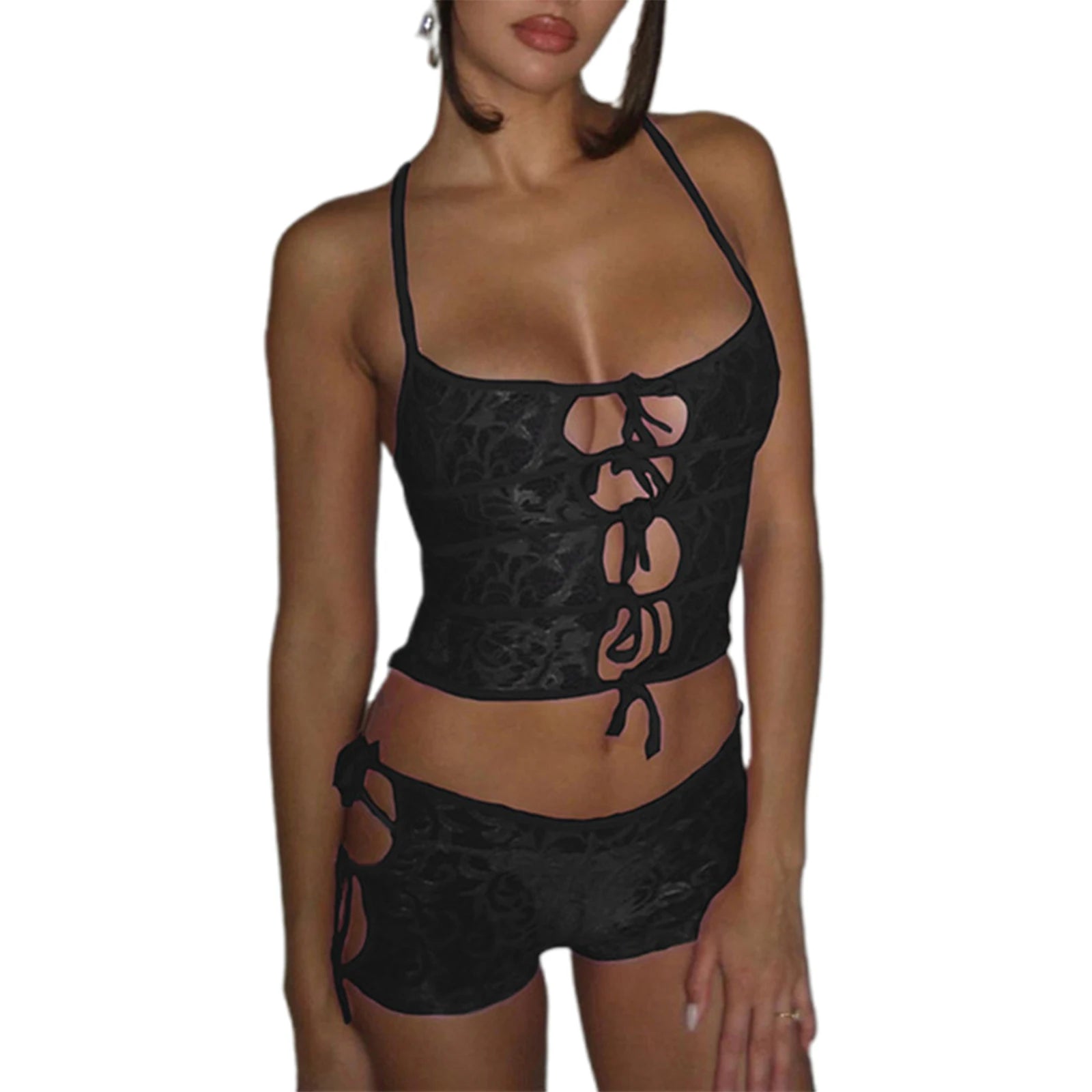 Lace Lingerie Set with Cut-Out Detail and Bodycon Shorts - Nightwear