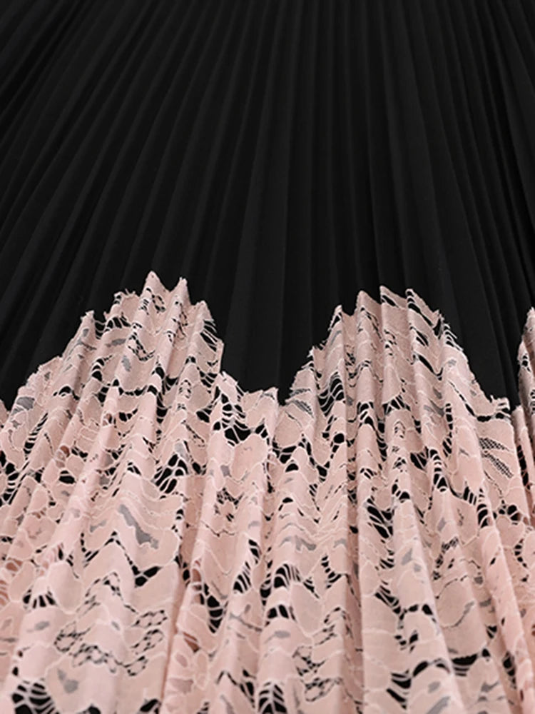 Lace Spliced Printing Pleated High Waist Loose Causal Colorblock Skirt