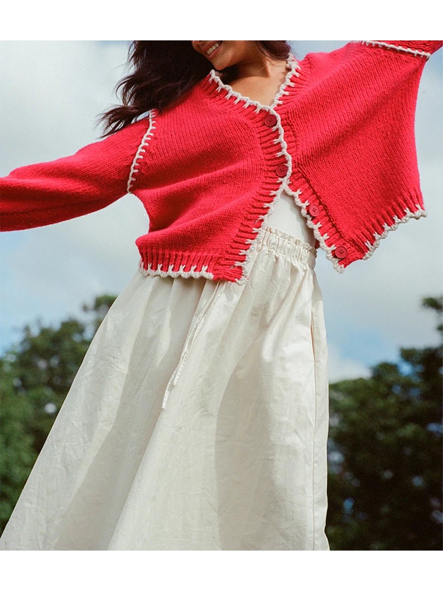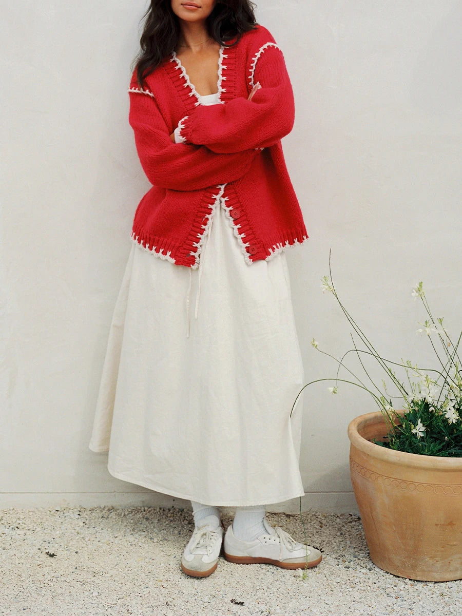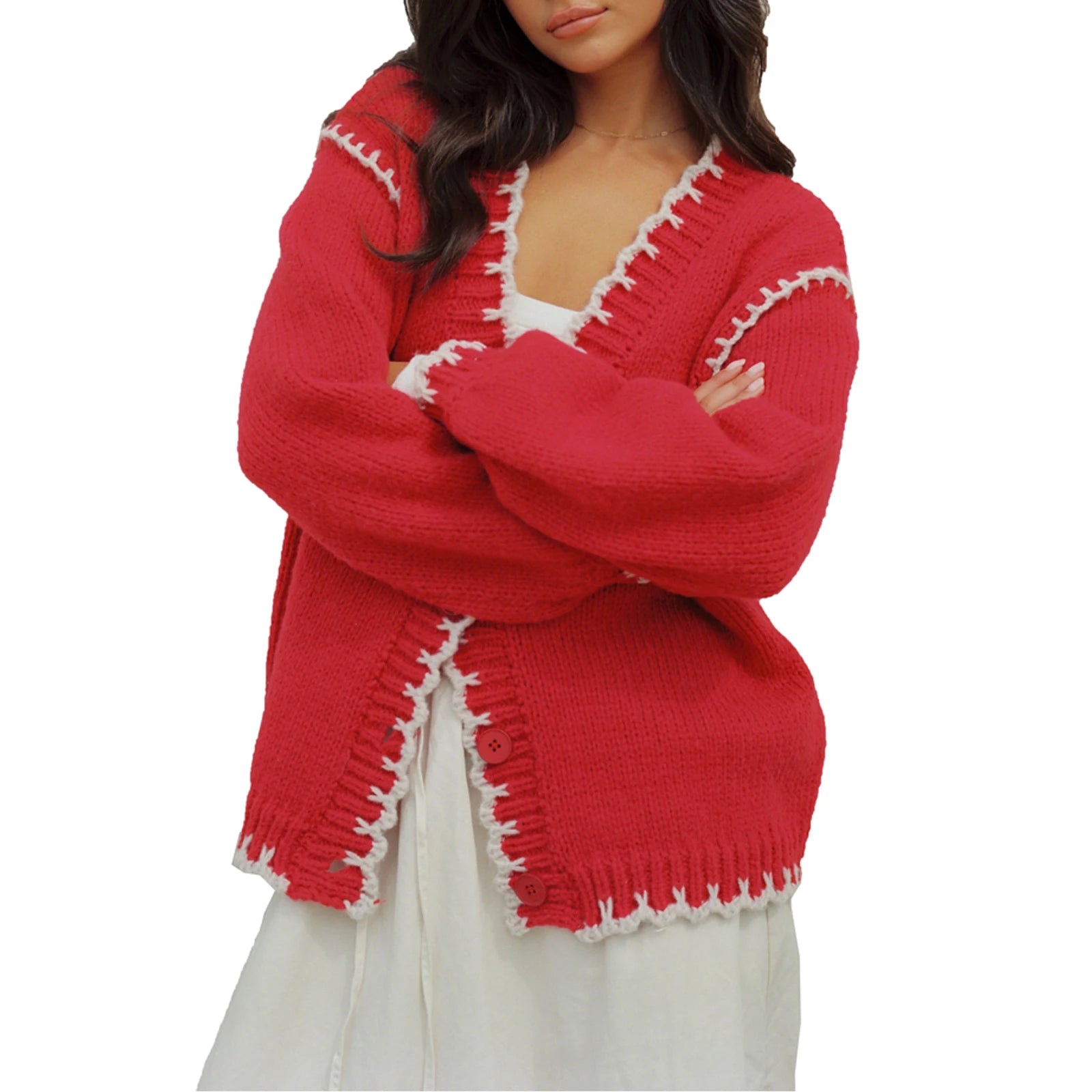 Women's Cable Knit Sweater Casual Contrast Line Long Sleeve V Neck Button Down Loose Cardigan Outwear