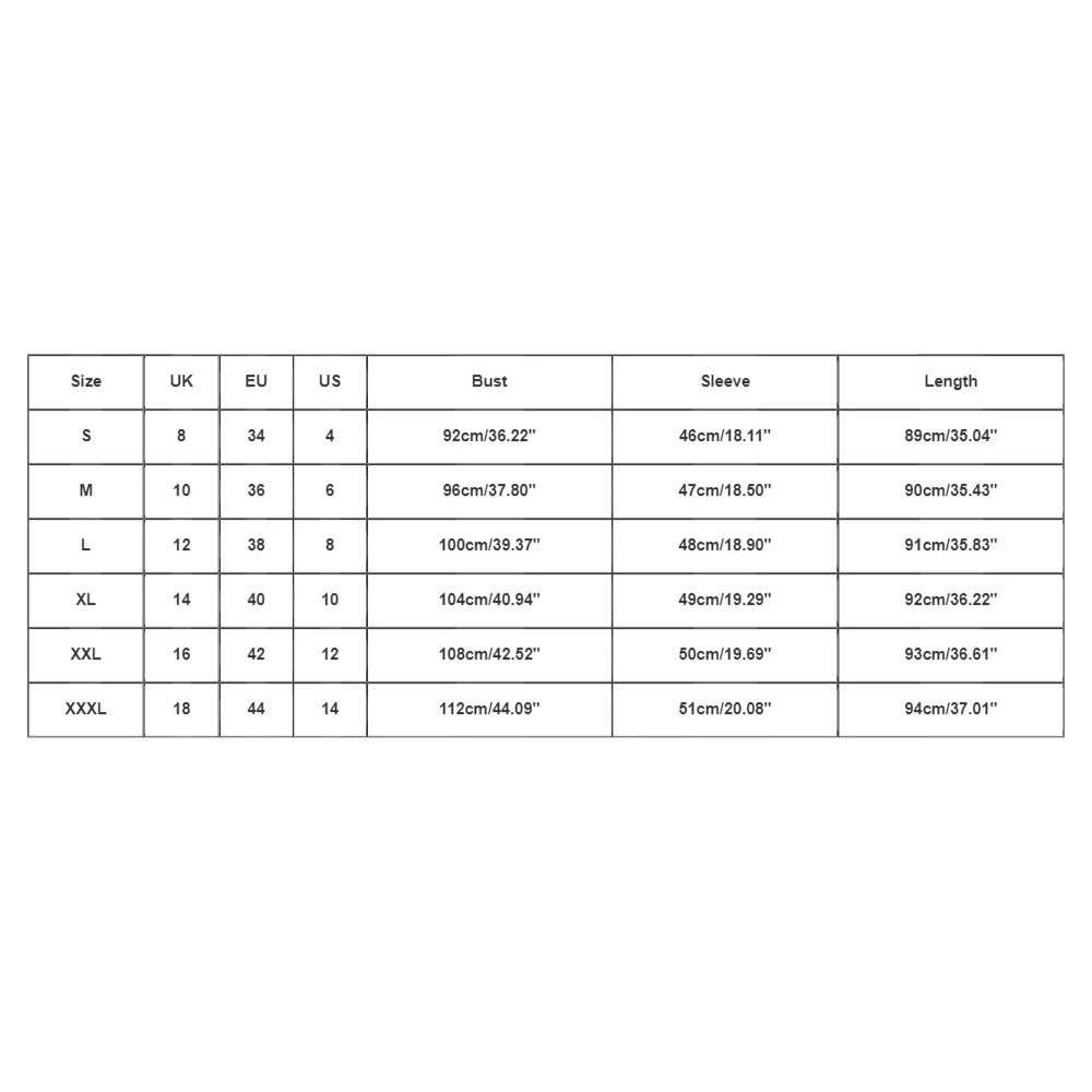 | Size:XXXL | UK:18 | EU:44 | US:14 | Bust:112cm/44.09'' | Sleeve:51cm/20.08'' | Length:94cm/37.01'' |