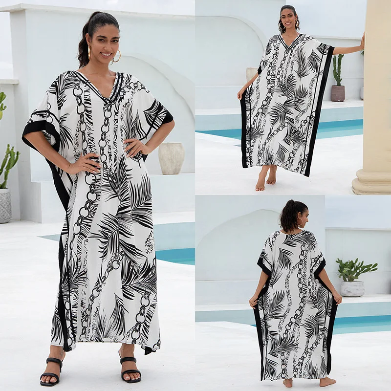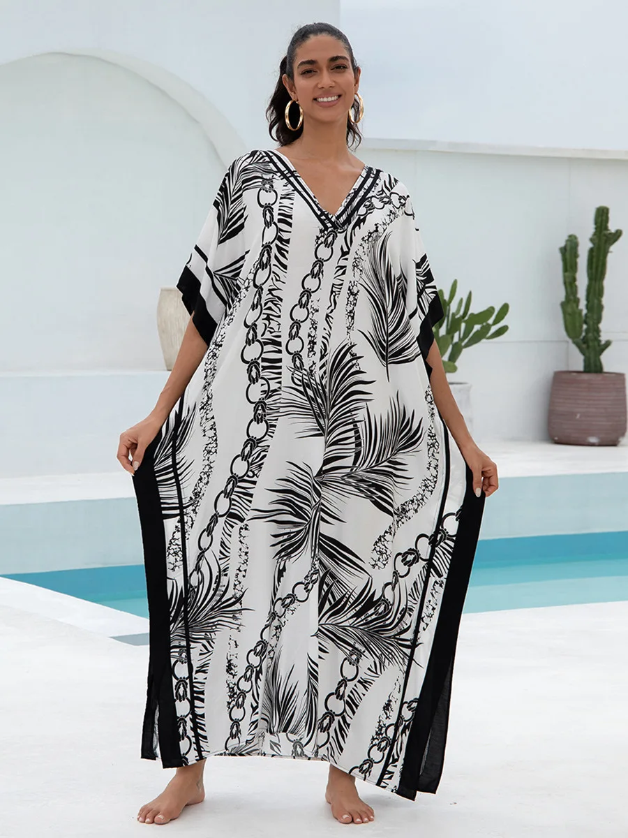Step into beachside elegance with this stunning leaf and chain print kaftan. Made from lightweight polyester, this loose-fitting long robe offers a breezy and comfortable feel, perfect for warm, sunny days. The V-neck design adds a touch of sophistication, while the flowing silhouette provides effortless style and sun protection. Ideal for a beach vacation, this chic kaftan is perfect for layering over swimwear or pairing with sandals for a relaxed yet fashionable look.