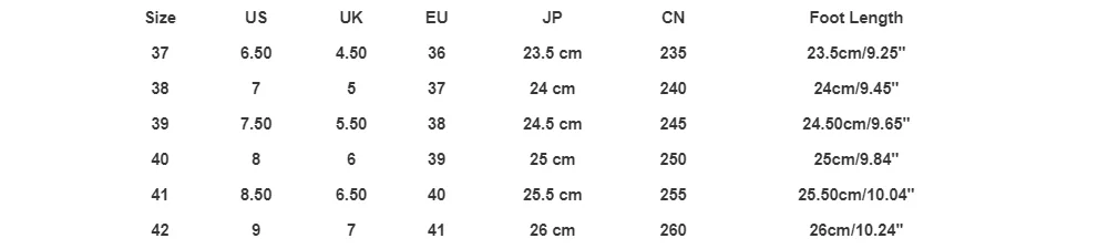 | Size:38 | US:7 | UK:5 | EU:37 | JP:24 cm | CN:240 | Foot Length:24cm/9.45'' |