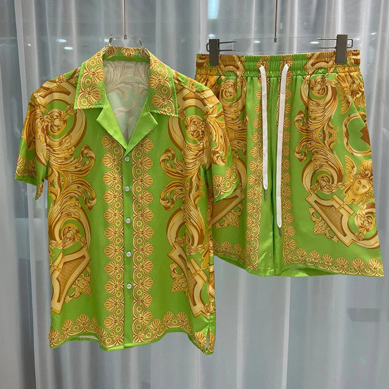Elevate your everyday style with this luxury men's 2-piece social shirt set, perfect for daily and casual occasions. Featuring a fashion-forward lapel short sleeve top and matching shorts, this outfit blends high-quality knit polyester with a relaxed, breathable fit. Finished with button details and bold prints, it's a standout ensemble designed for comfort and effortless sophistication during spring and summer.