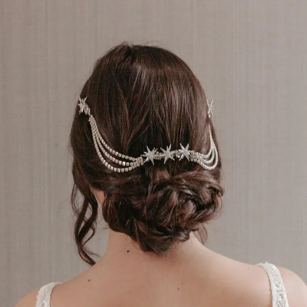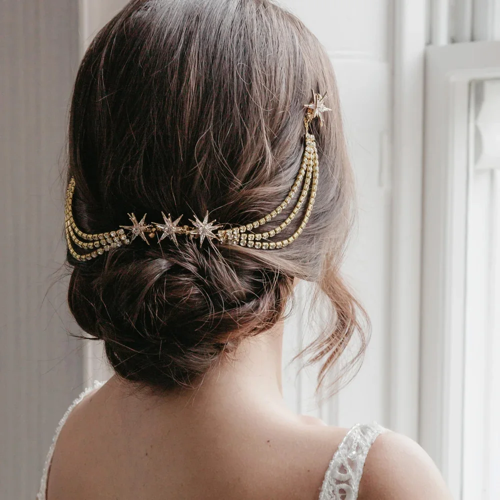 This vintage star hair chain is a trendy accessory designed for women. Made from rhinestone and copper, it adds a touch of elegance and sparkle to any hairstyle. Available in gold and silver, the star-shaped design enhances its bohemian look, making it perfect for boho-style outfits. This hair accessory functions as both a hair comb and a hair comb chain, providing versatility and style. Whether you're attending a party, festival, or casual outing, this accessory will elevate your hairstyle effortlessly.