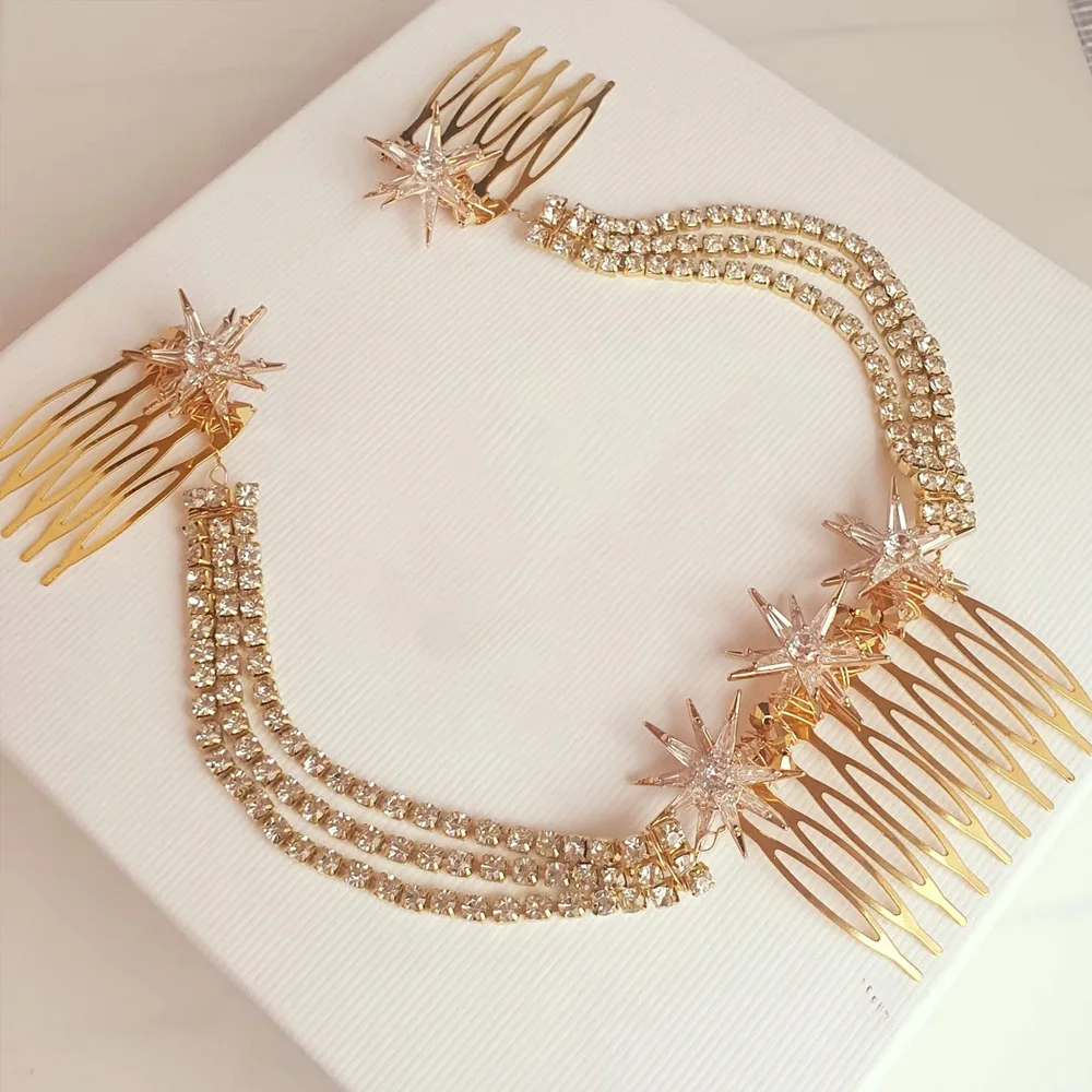 Luxury Star Hair Comb Rhinestone Chain Jewelry for Women Vintage Multilayer Hair Chain