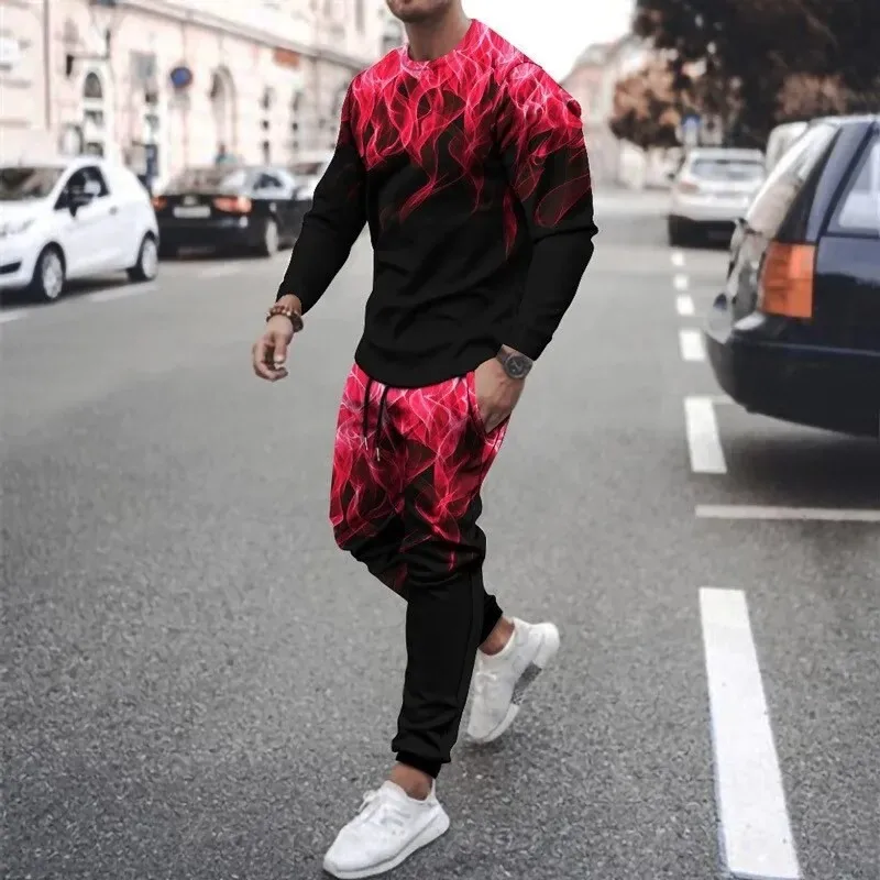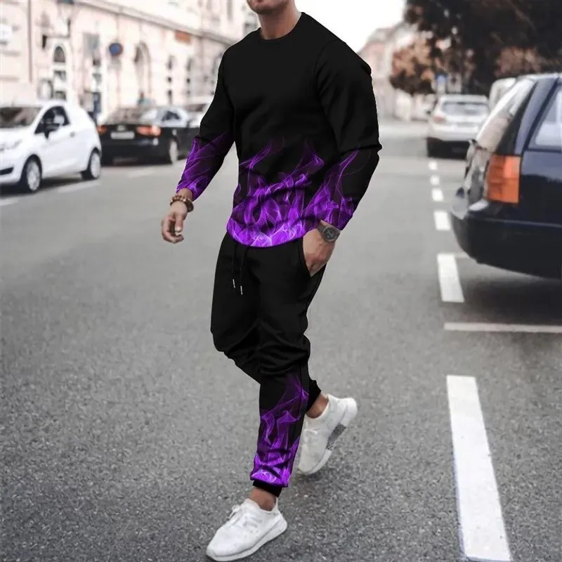 Unwind in bold style with this Men's 3D Printed Sweatshirt Set, perfect for relaxing or light summer activities. Featuring a colorful flame design, the set includes a lightweight crew neck sweatshirt and matching drawstring sweatpants. Made from breathable, thin polyester knit, it offers comfort without bulk. With its eye-catching print and casual fit, this set is ideal for lounging, casual outings, or expressing your unique style in warmer weather.