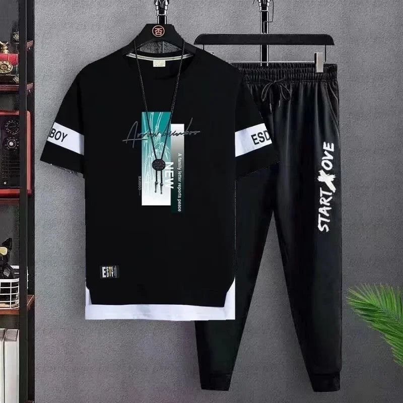 Men's Fashion Casual Set Versatile Youth Round Neck Slim Fit Short sleeved T-shirt+Fashion Sports Pants Two Piece Set for Men
