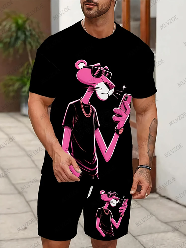 Men's Tracksuit Sets Pink Panther Short Sleeve T-Shirt Suit Casual Suit Sports Streetwear Shorts 2 Piece Male Clothes
