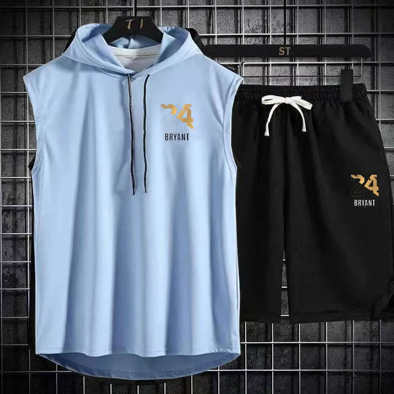 Hit the beach or the gym in style with this men's two-piece summer set. Featuring a casual sleeveless V-neck T-shirt and matching elastic waist shorts, this breathable tracksuit blends cotton blends with a comfortable knit weave. Designed for sports and active lifestyles, the printed fabric and hooded sleeveless tee add a fashionable edge to your warm-weather wardrobe.