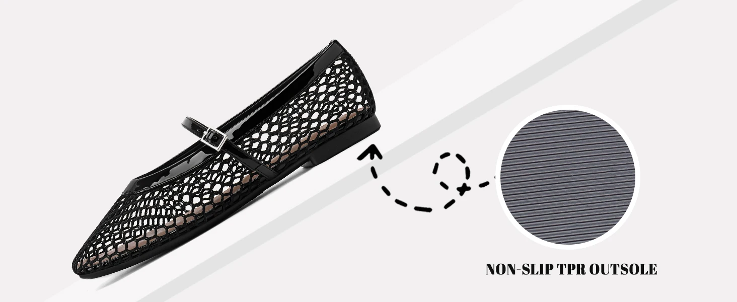 These women’s mesh Mary Jane ballet flats combine elegance, comfort, and breathable design for effortless summer style. Featuring a chic small square toe and shiny patent leather trim, they offer a fashionable twist on a classic silhouette. The adjustable Mary Jane strap ensures a secure, personalized fit, while the fishnet mesh upper enhances breathability, keeping your feet cool and comfortable on warm days. A cushioned insole and non-slip rubber outsole provide lasting support and traction, making them perfect for everyday wear. Whether you're headed to a party, shopping, or just strolling the streets, these flats add a modern, feminine touch to any outfit.