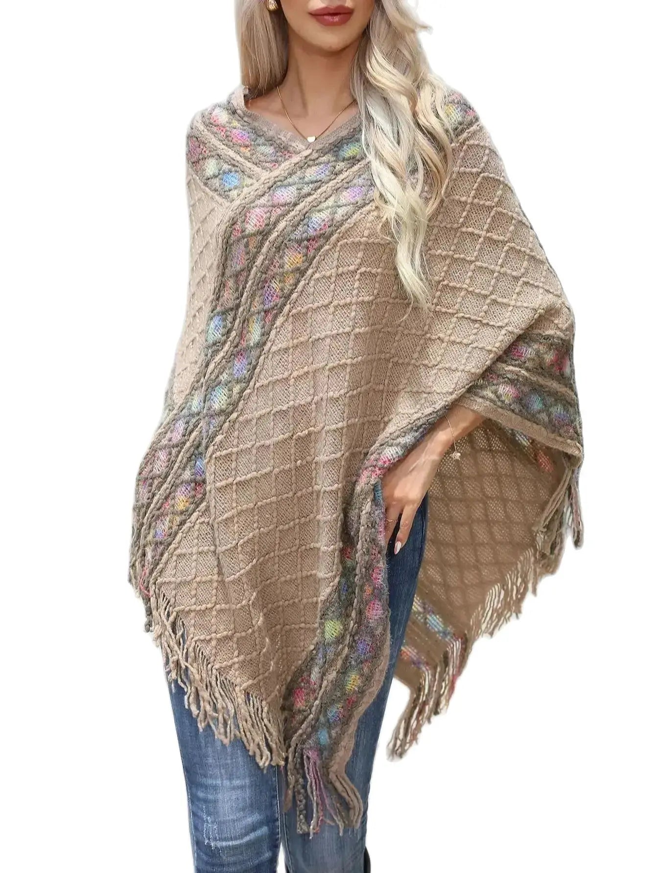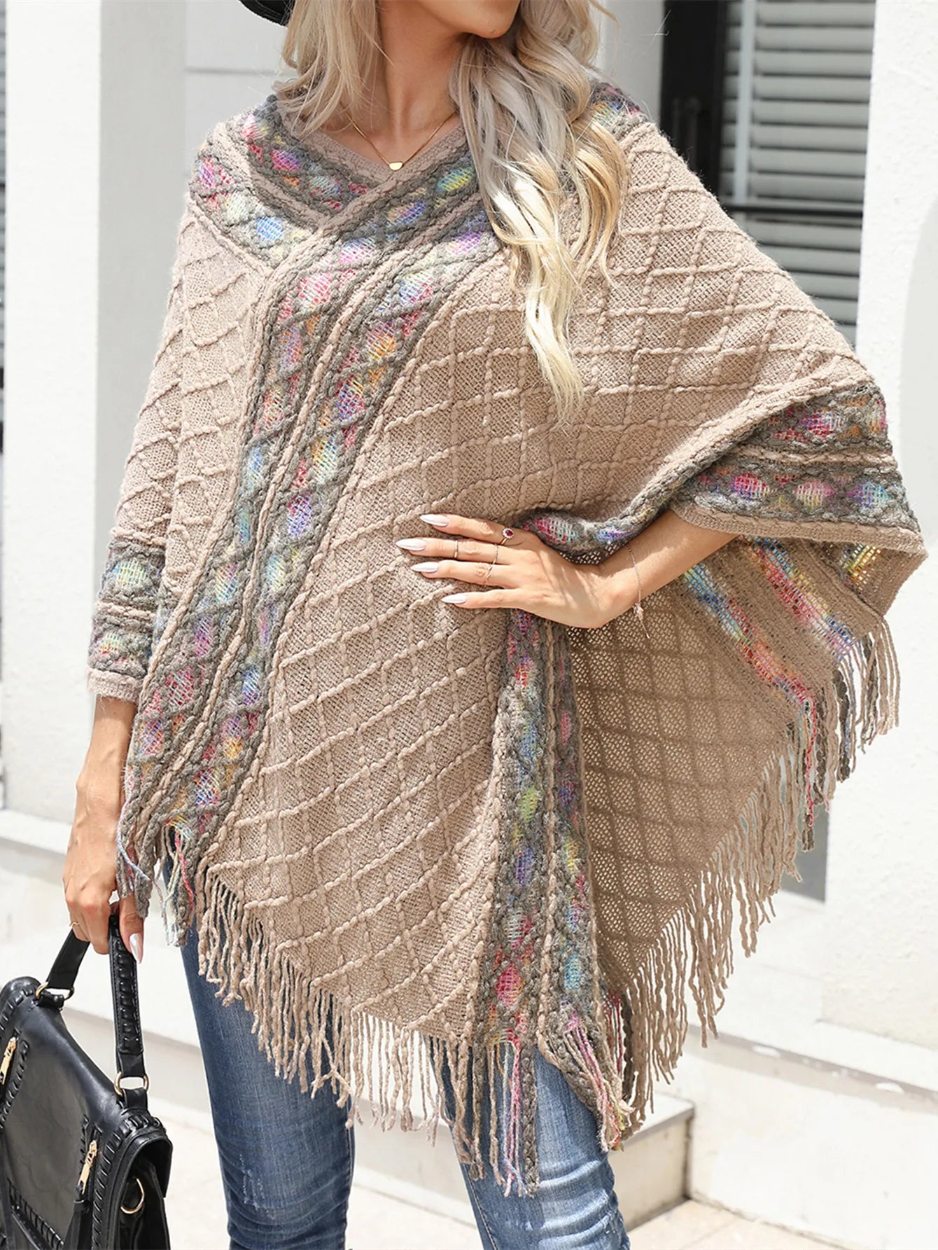 New Tassel Sweater Plus Size Pullover Shawl V-Neck Knitwear Women's Straight Shoulder Rainbow Striped Tassel Cape Shawl Sweater