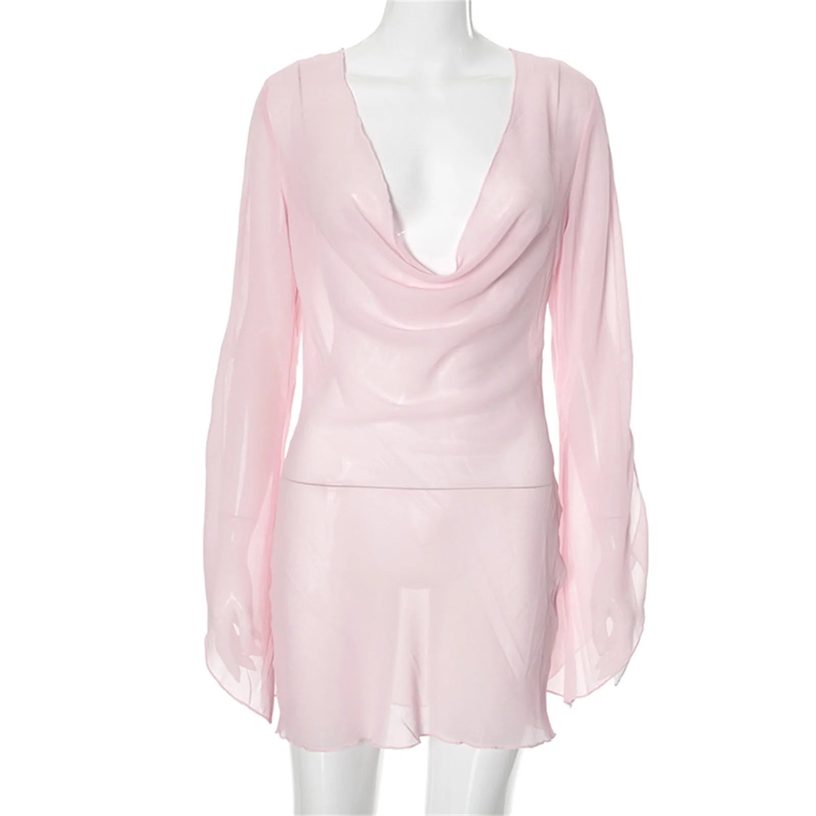 A super chic and flirty nightgown! The sheer mesh and backless design with a cowl neck create an effortlessly elegant yet sultry look. The above-knee length gives it a playful vibe, perfect for a night in or even for a special occasion where you're looking to feel both comfy and sexy.