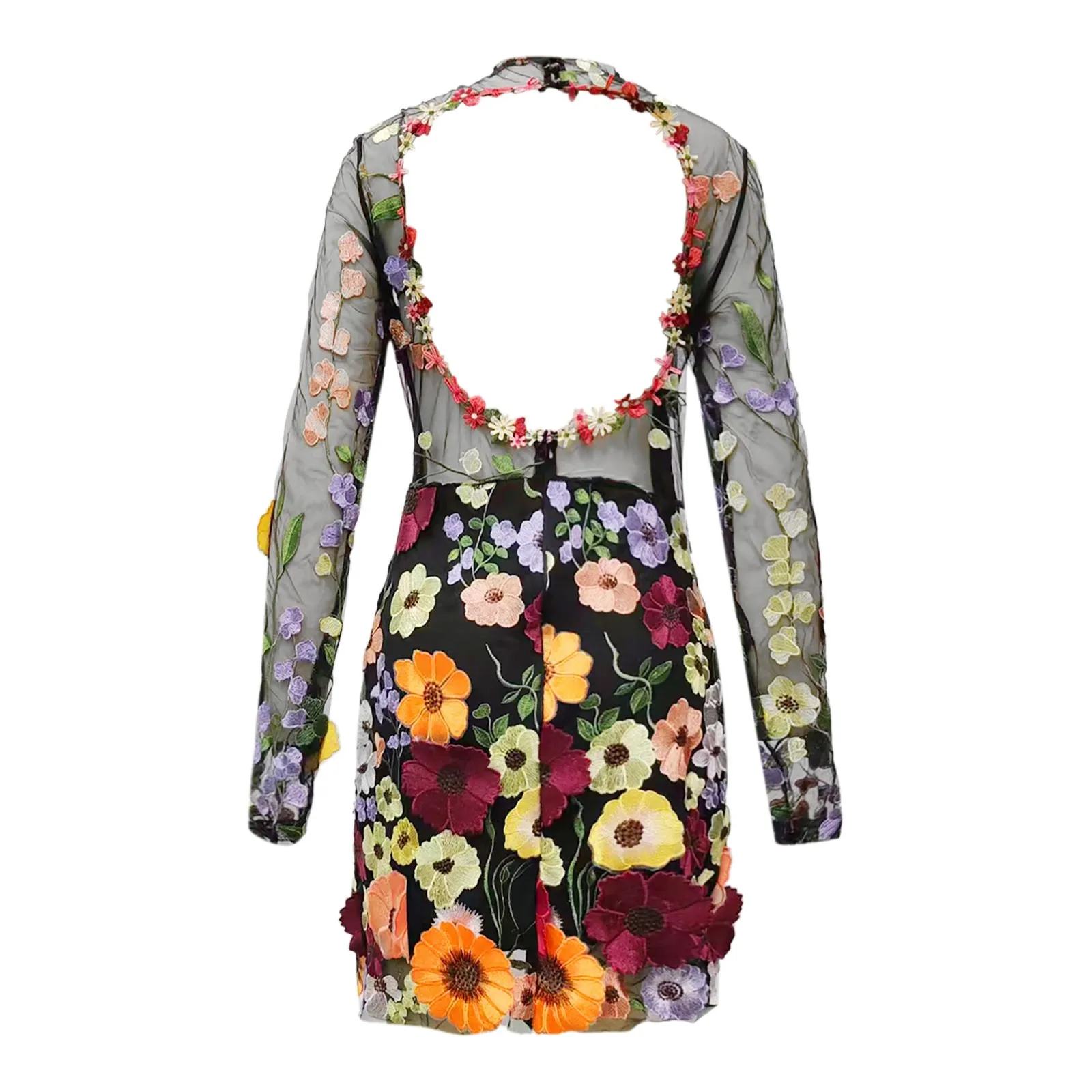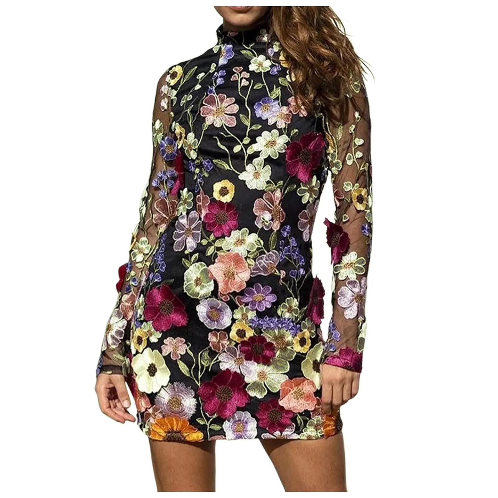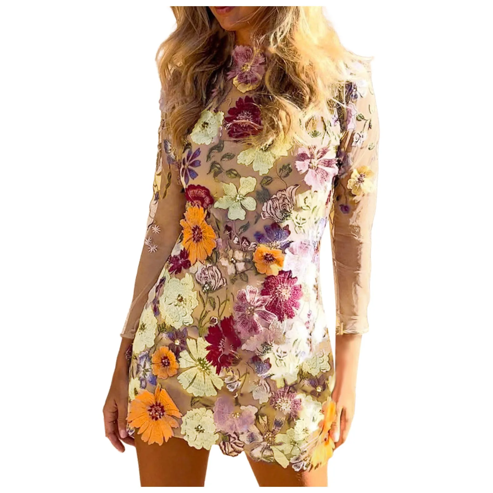 Women Summer Dresses 3D Floral Embroidery Sheer Mesh Lace Party Cocktail Dress