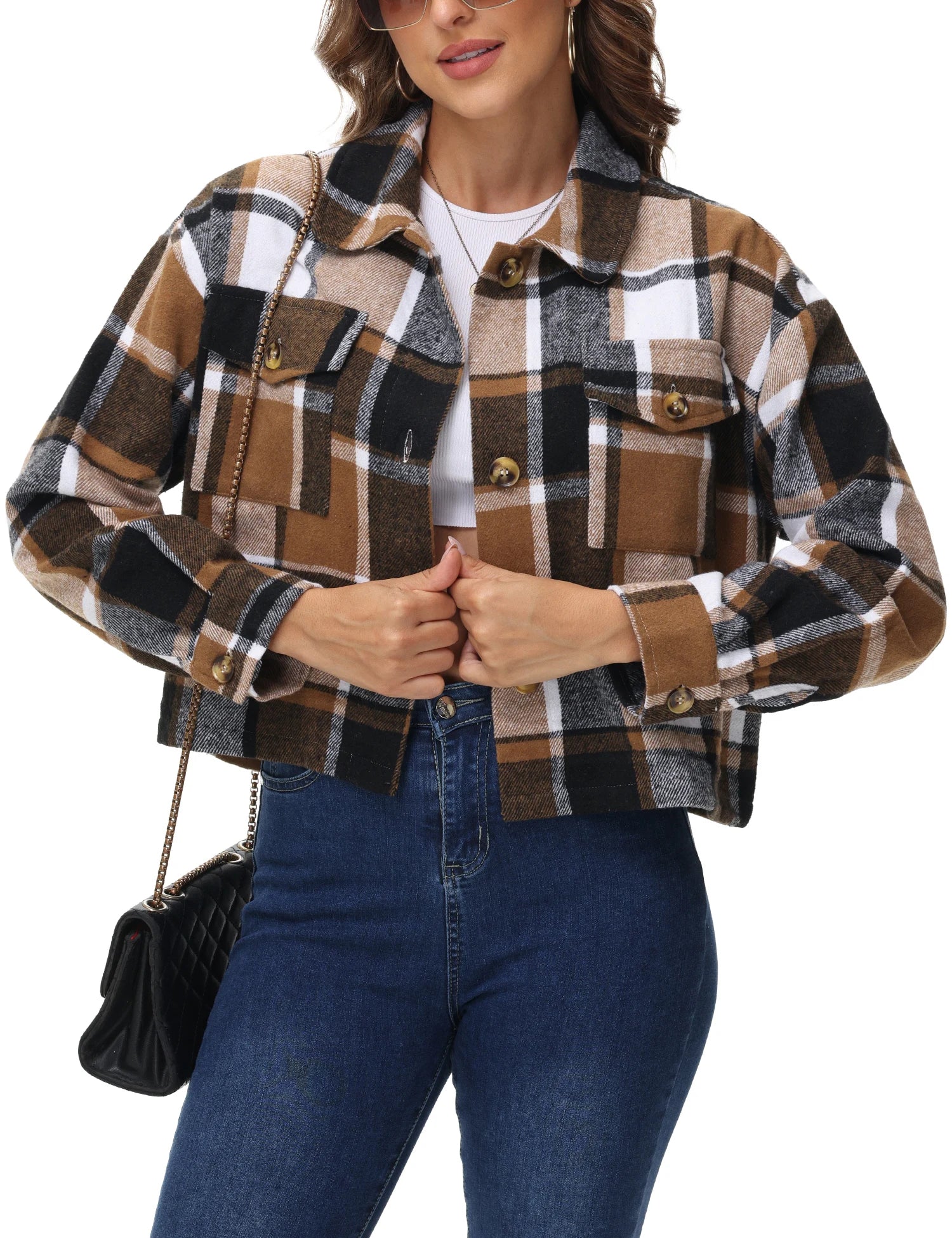 Oversized Plaid Shacket - Cozy Long Sleeve Button Down Jacket with Pockets Cropped