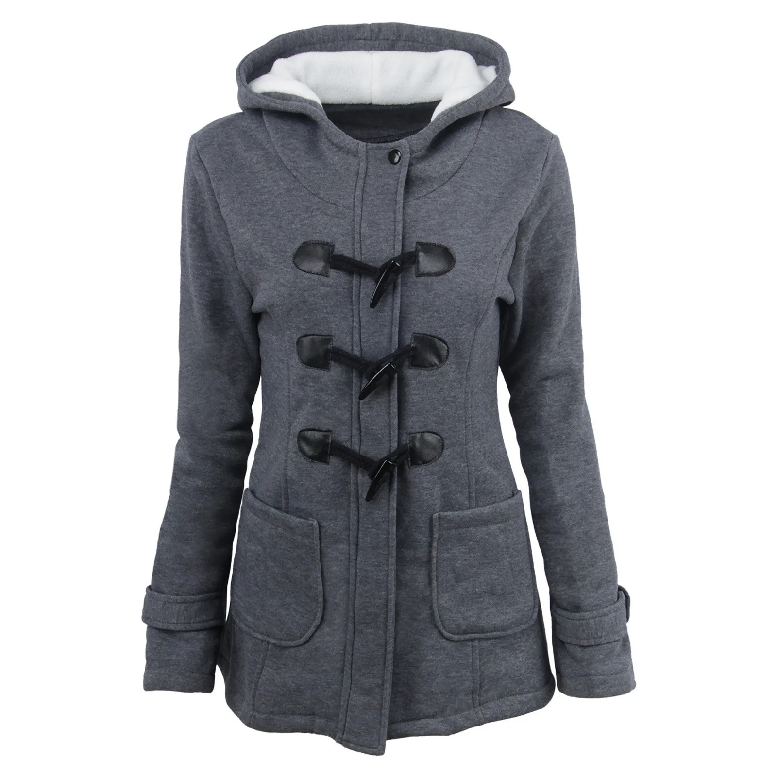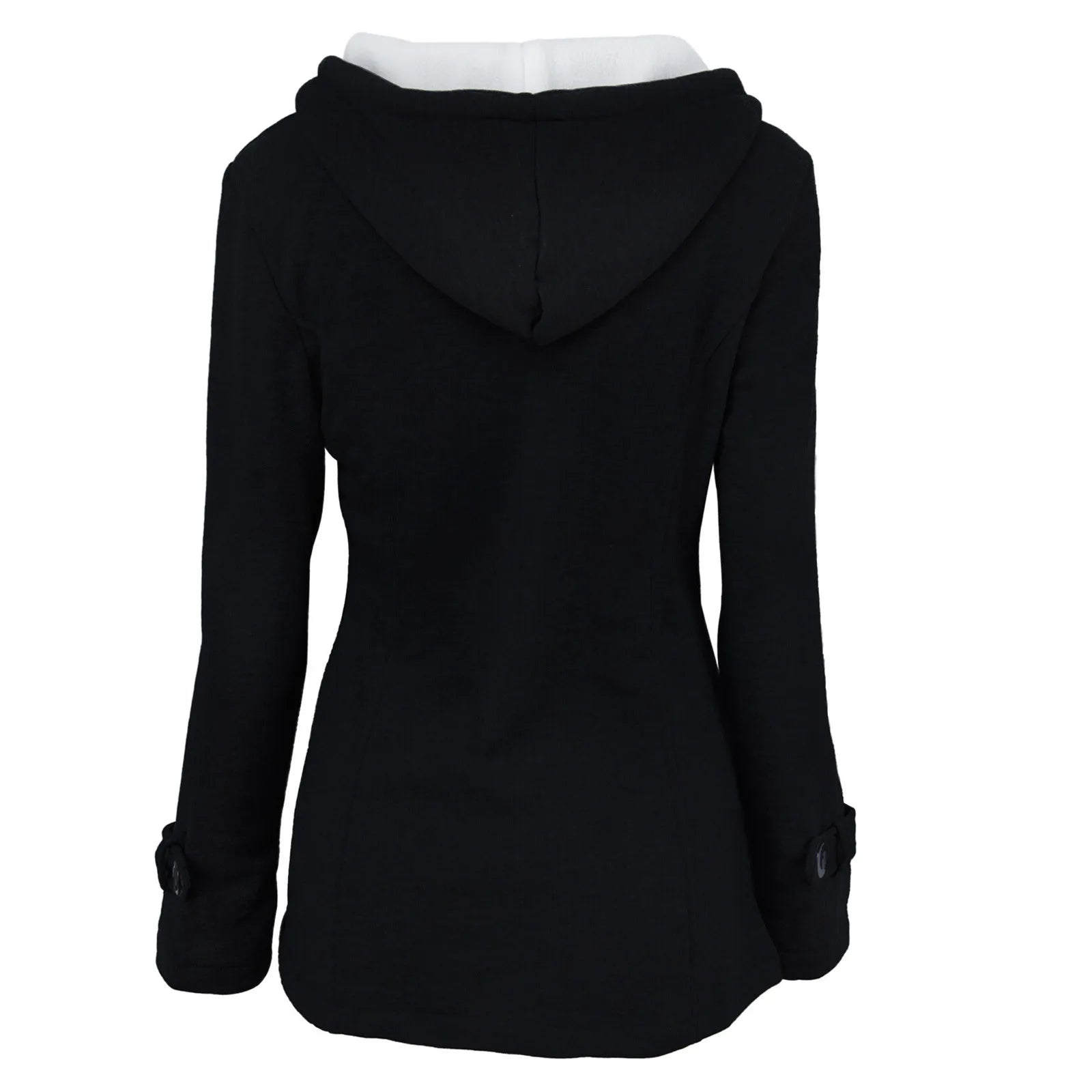 Women Solid Color Horn Buttons Cardigan Padded Hooded Coat Jacket Overcoat