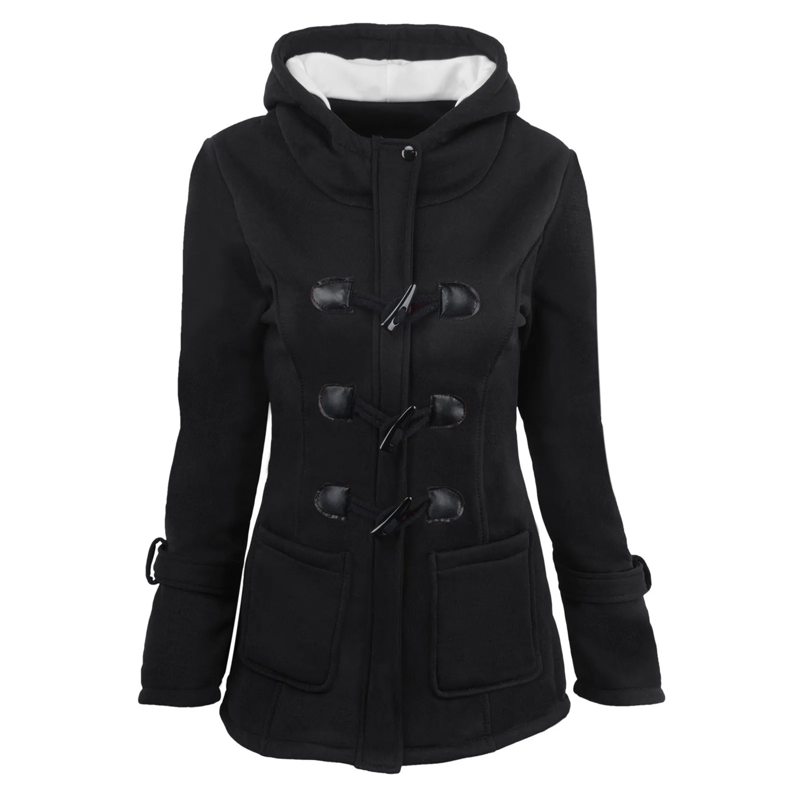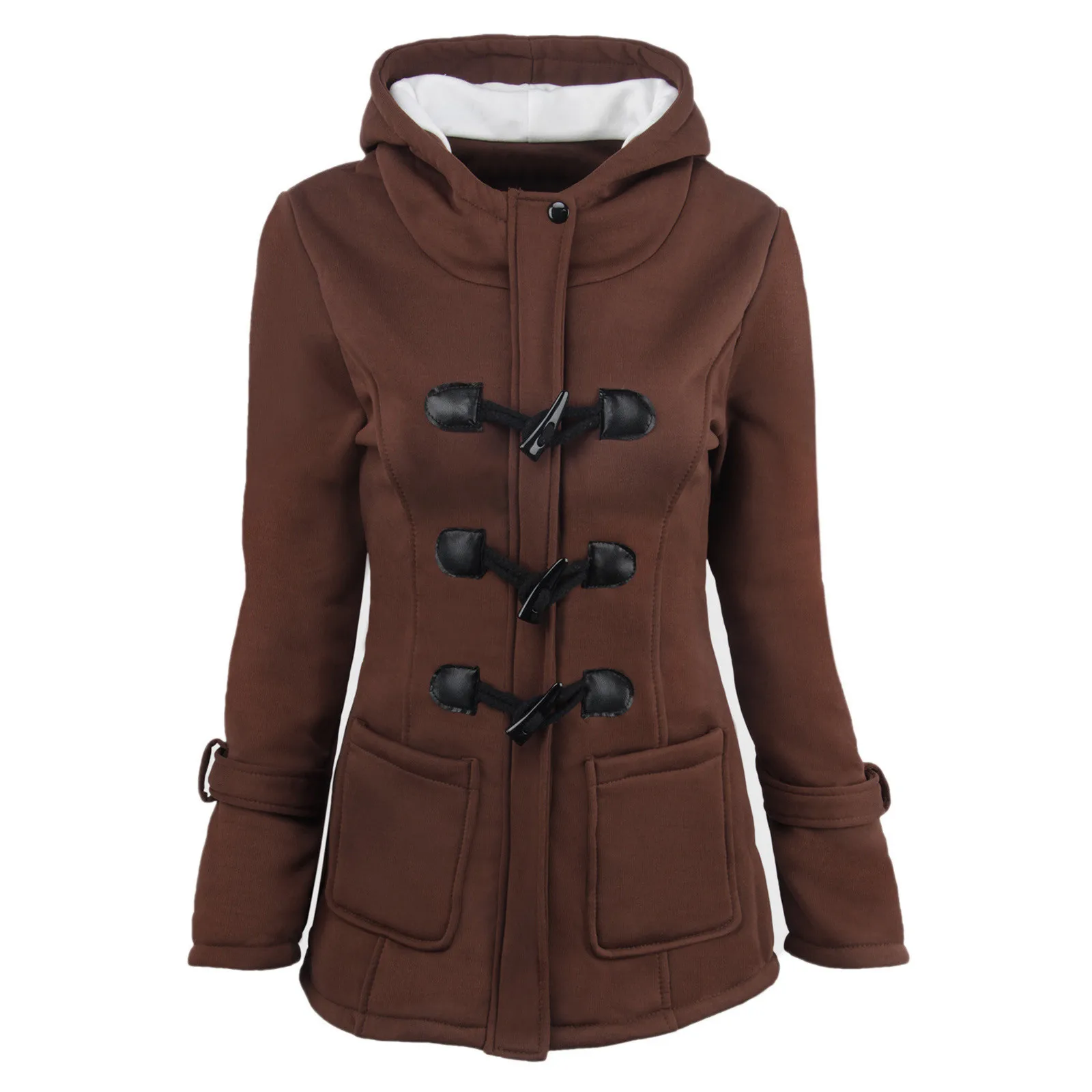 Padded Women Solid Color Hooded Overcoat Horn Buttons Warm Cardigan Overcoat Jacket