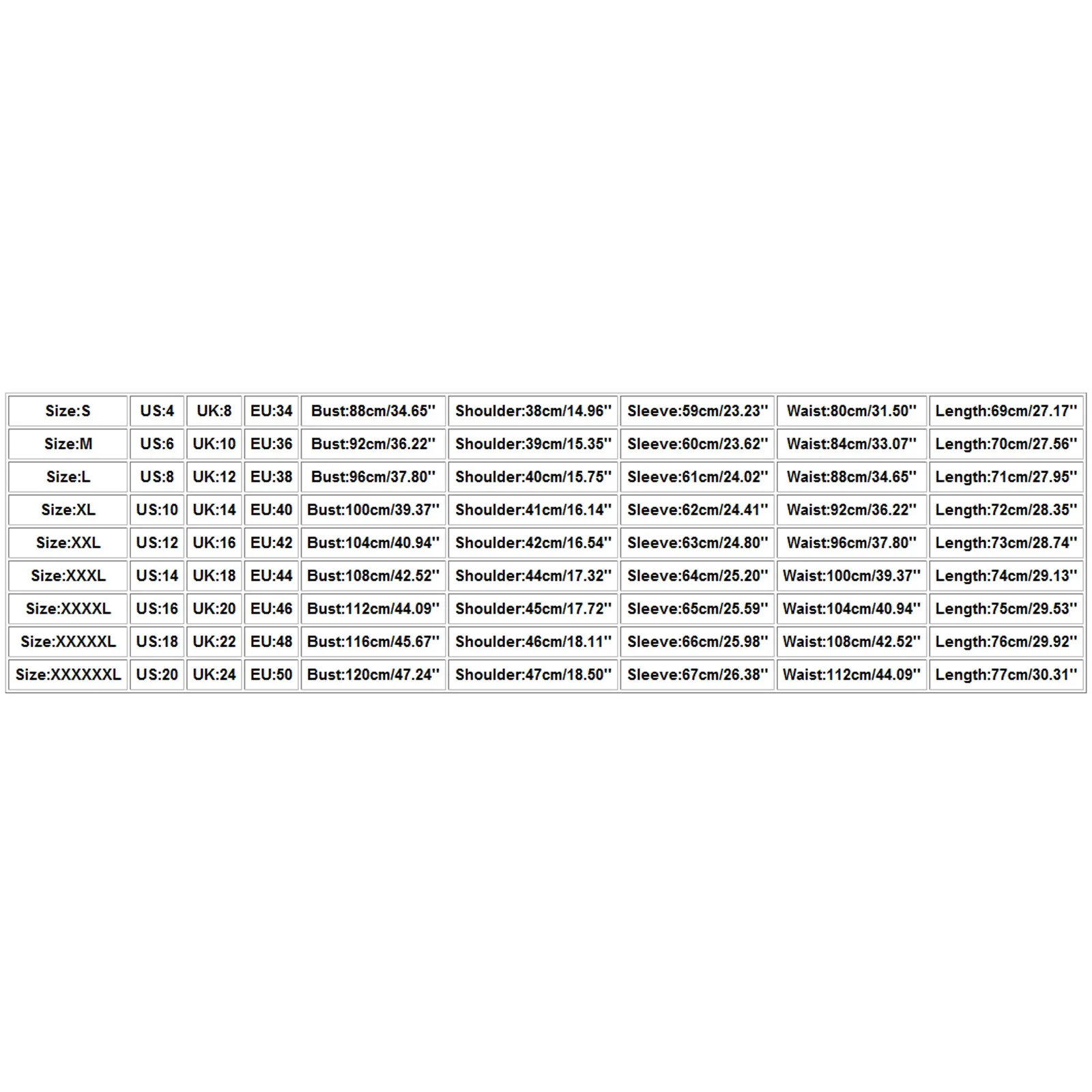 | Size:XXXL | US:14 | UK:18 | EU:44 | Bust:108cm/42.52'' | Shoulder:44cm/17.32'' | Sleeve:64cm/25.20'' | Waist:100cm/39.37'' | Length:74cm/29.13'' |