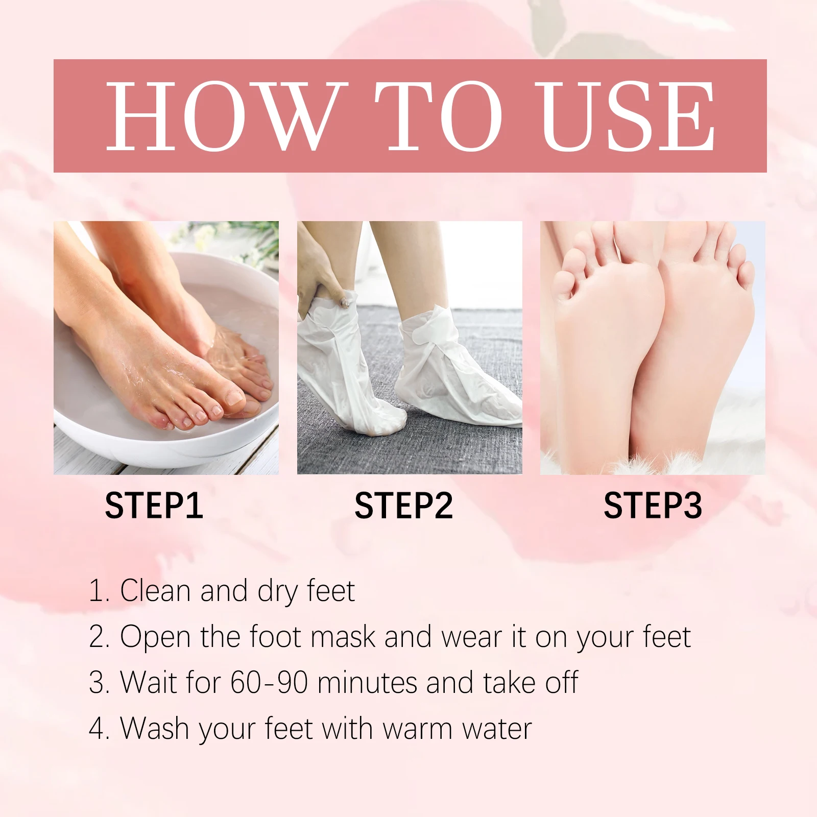 4. Wash your feet with warm water. The peach foot mask is infused with powerful essence and penetrates into the deep skin. The unique sock like design promotes absorption and allows natural ingredients to exert their magical power, solving problems such as dryness, roughness, cracking, and even fine lines.