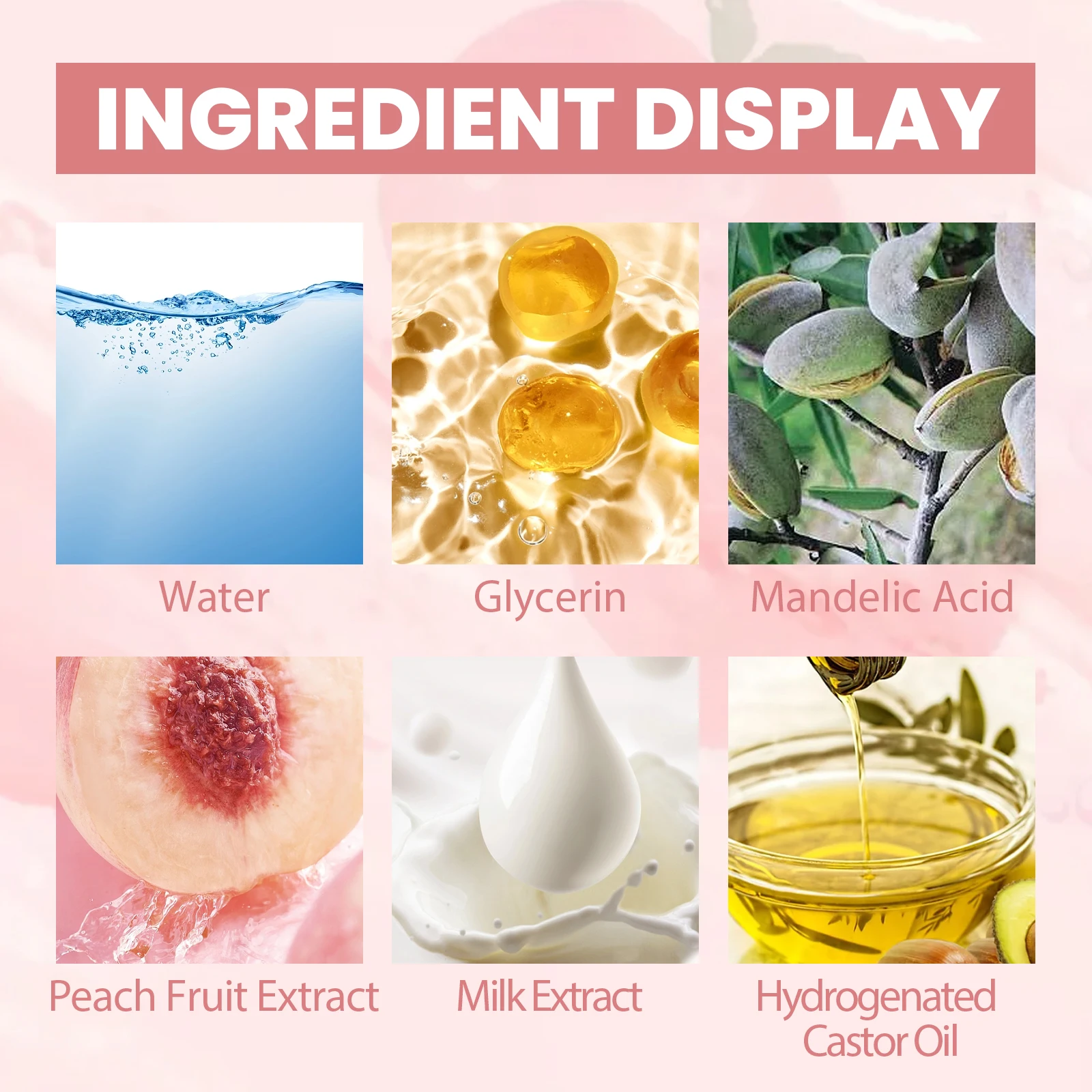 Our peach foot mask contains glycerol, mandelic acid, and peach fruit extract.