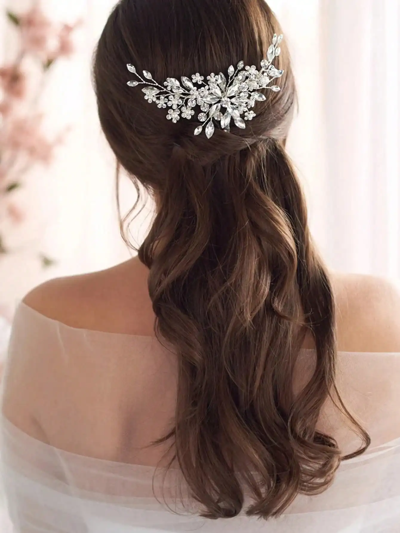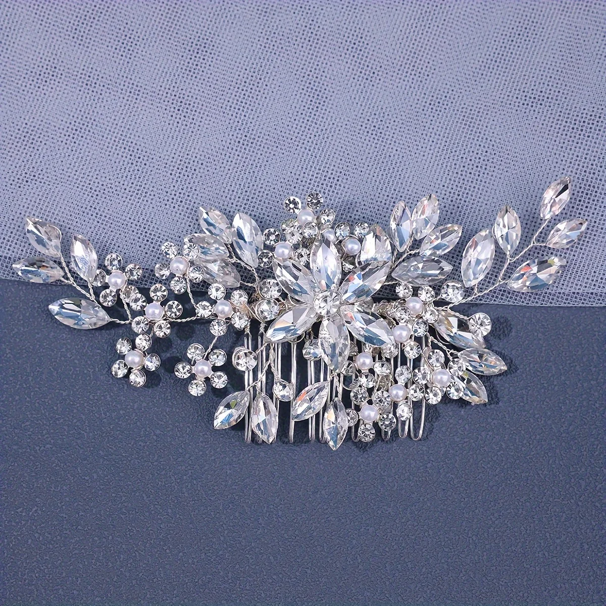 Add a touch of elegance to your bridal look with this pearl and crystal flower hair comb. Featuring rhinestone accents, this metal headpiece is the perfect wedding accessory, doubling as a tiara or headband for a sparkling, romantic finish to your hair on your special day.