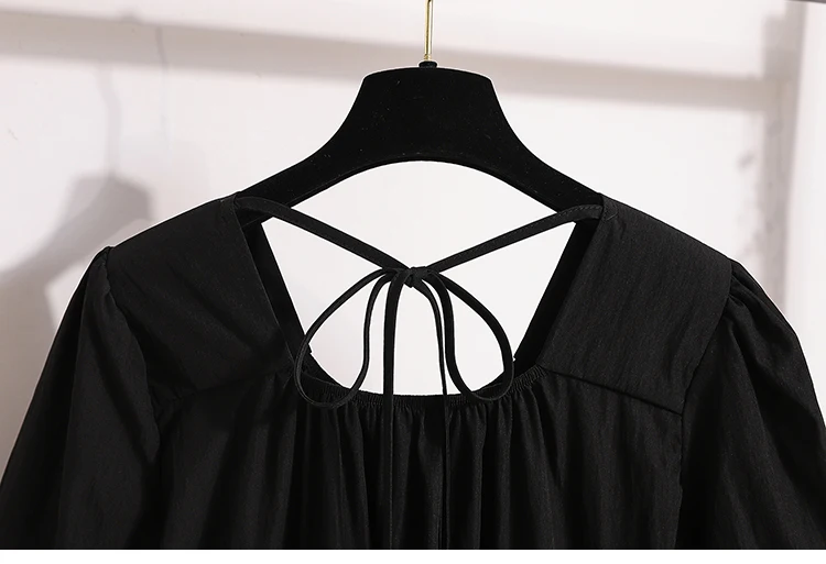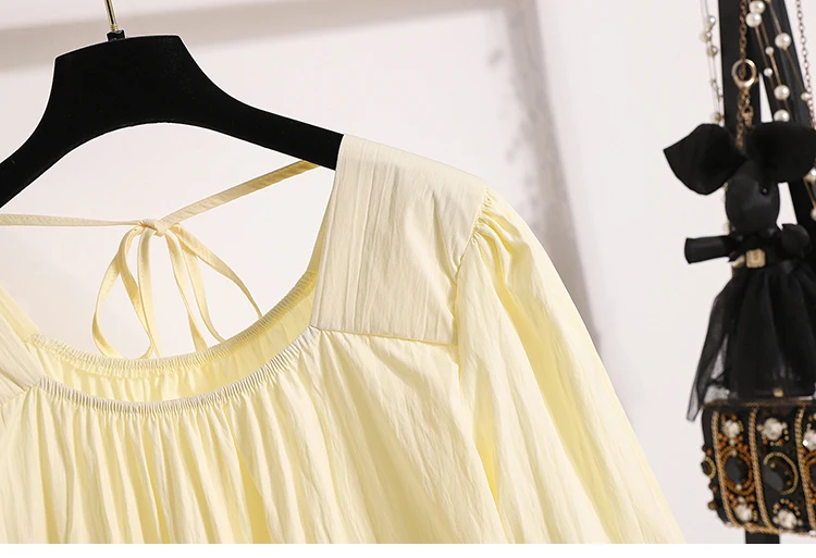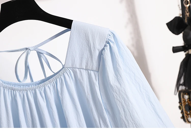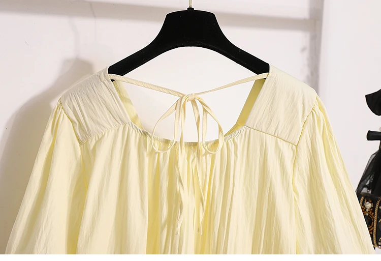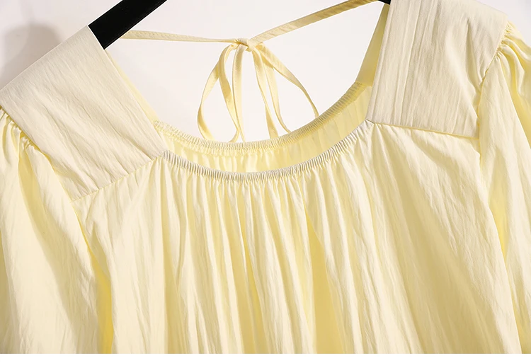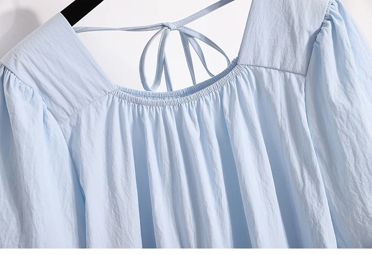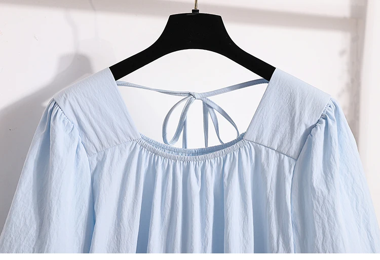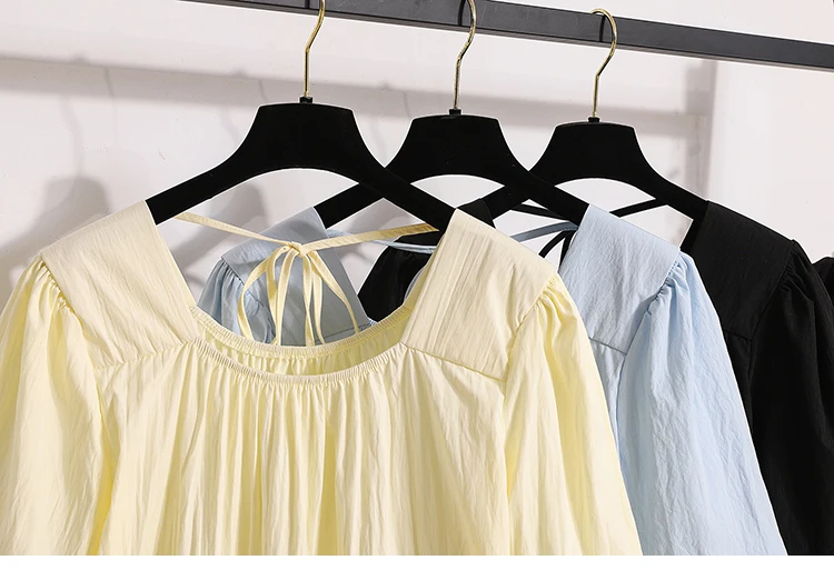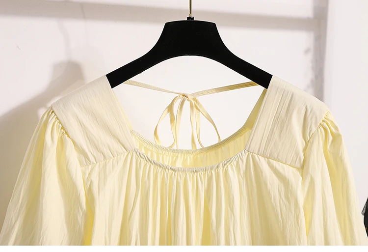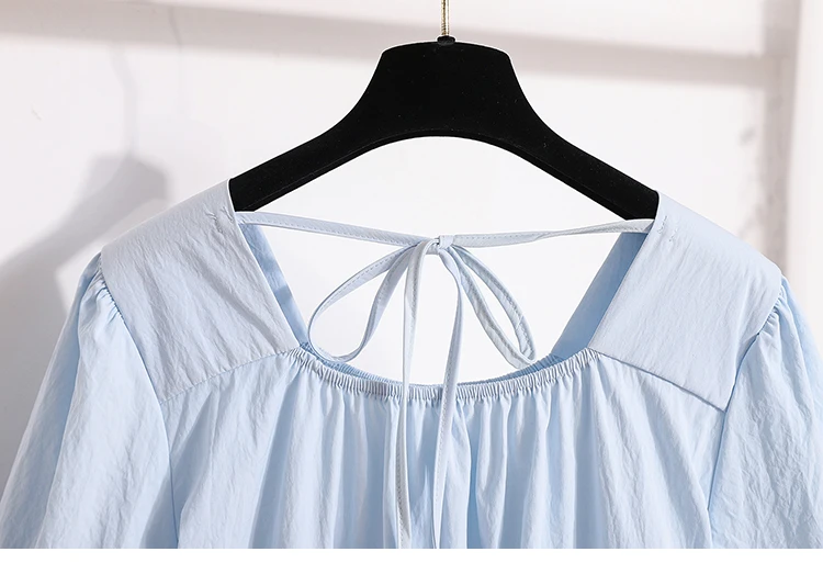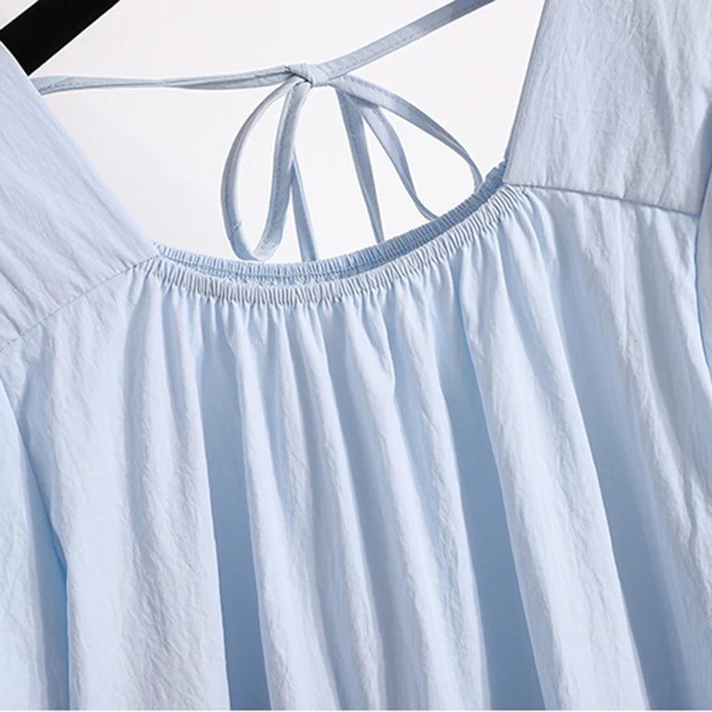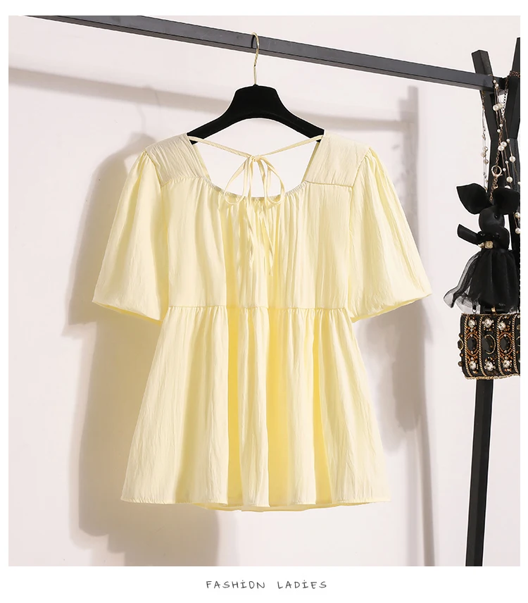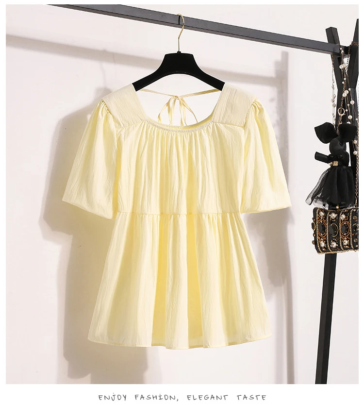 This sweet-style women's blouse is a charming addition to any spring or summer wardrobe, featuring a pullover design with lace-up detailing for a playful touch. Crafted from lightweight, non-stretch polyester fiber, it offers a comfortable loose fit and soft structure. The short puff sleeves and solid color enhance its feminine look, perfect for pairing with skirts or high-waisted jeans.