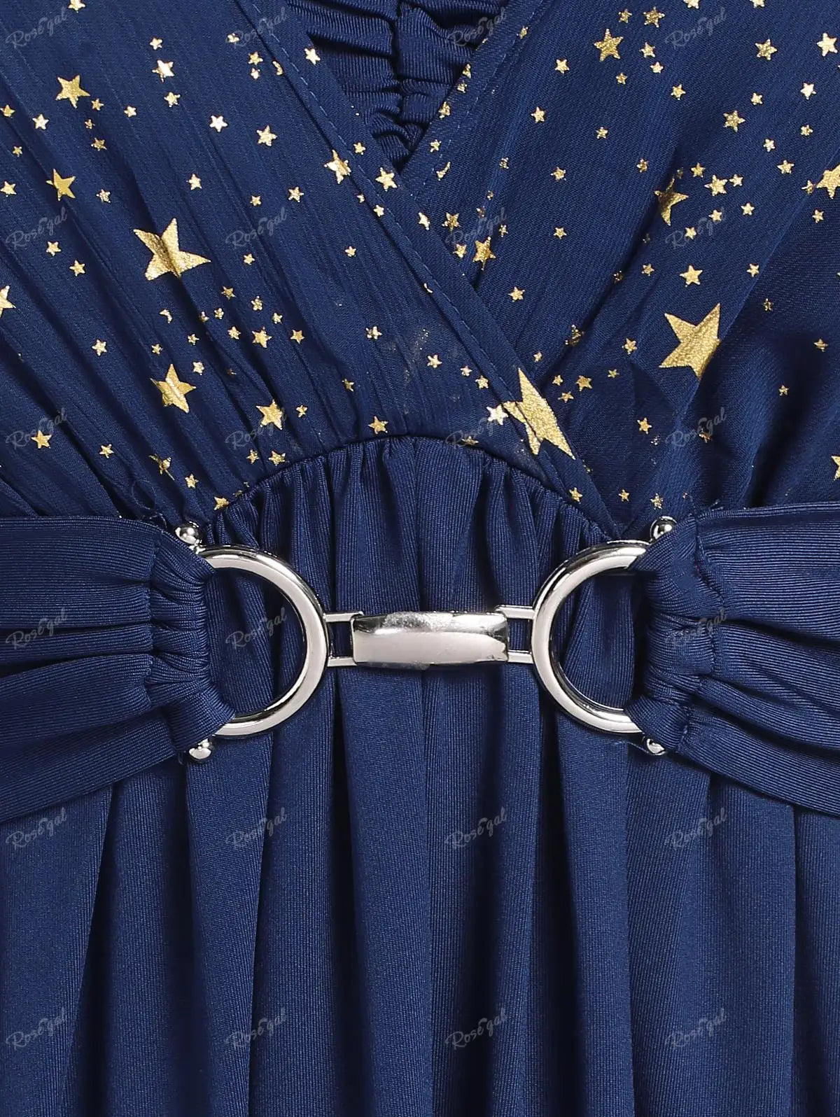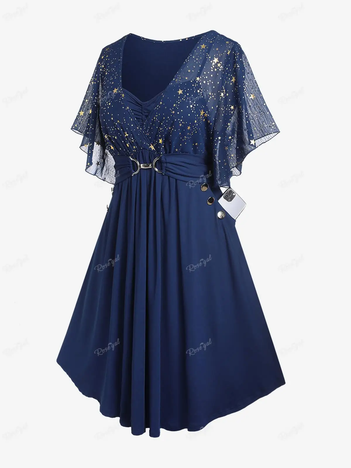 Plus Size Stars Print Buckle Button Pockets Ruched Butterfly Sleeves Dress Women Casual V-neck Collar Dresses