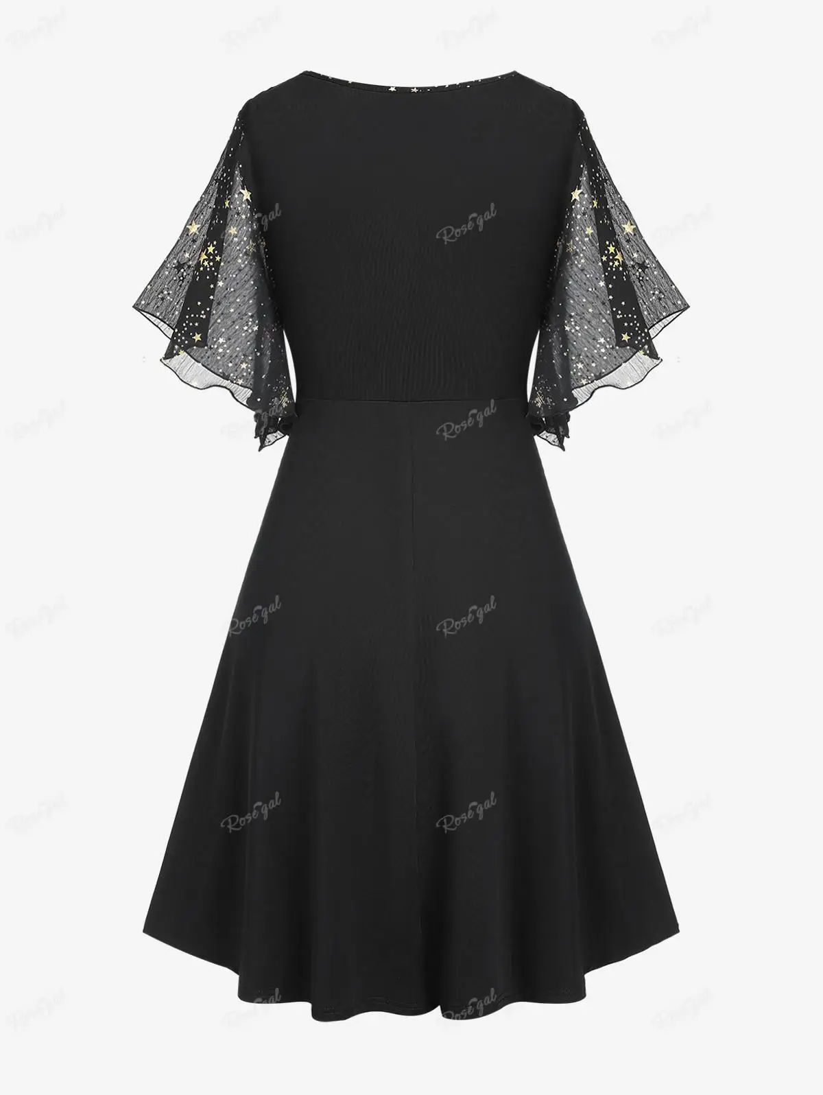 Elevate your everyday look with this plus size mid-calf dress featuring a charming star print and butterfly sleeves. Designed with a pullover closure, buckle button detailing, and convenient side pockets, this dress blends fashion and function. Made from soft polyester synthetic fiber, it offers a ruched bodice, V-neck collar, and a flattering empire waistline that flows into a relaxed A-line silhouette. Perfect for casual outings, weekends, or warm-weather events.