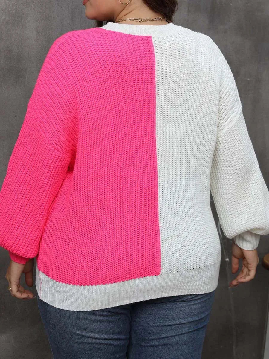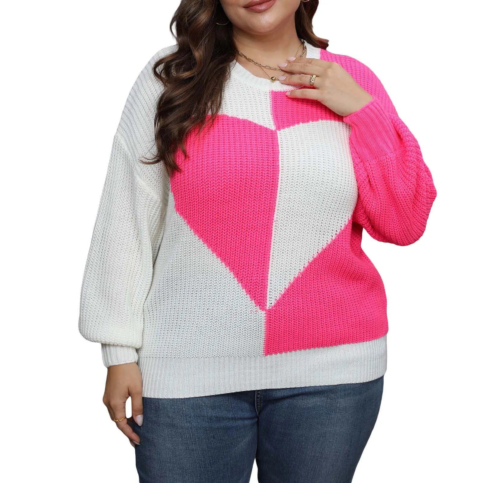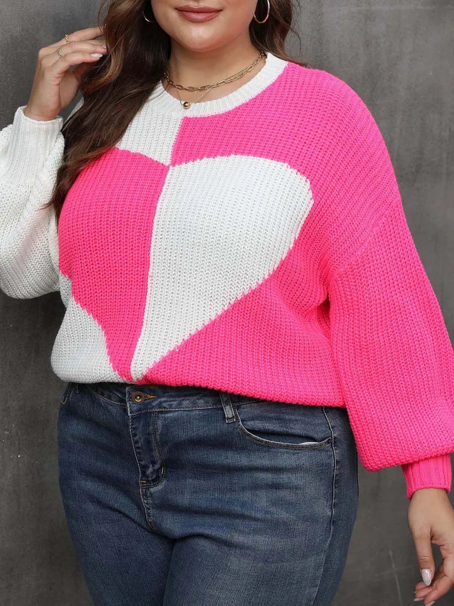 Women Plus Size Sweaters Casual Heart Contrast Color Warm Long Sleeve Pullover Basic Knitwear for Fall Streetwear