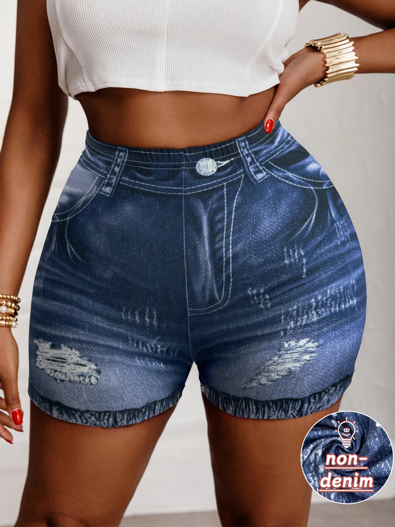 Discover ultimate comfort and style with our Plus Size Women's Skinny Shorts featuring a trendy imitation denim print. Designed for the fashion-forward, these shorts boast creative patterns that mimic distressed denim, ensuring both comfort and high elasticity. Say goodbye to the discomforts of traditional jeans with our knit fabric that offers unparalleled stretch and freedom of movement. Whether you're lounging at home or stepping out for a casual outing, these shorts blend fashion with functionality effortlessly.